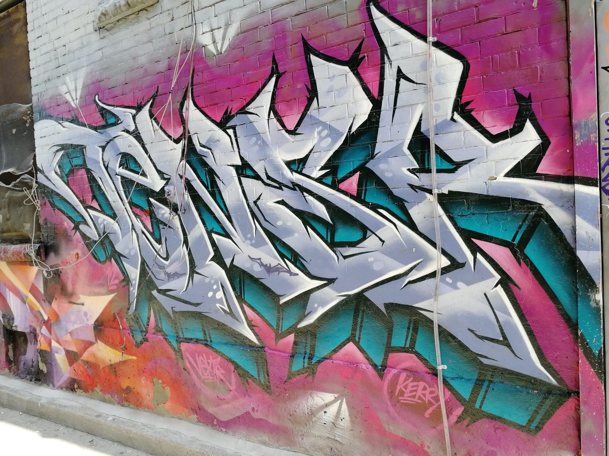 L’oeuvre est de type graffiti. Vous pouvez l’admirer dans la ville de Toronto en Canada et plus précisément ici : 50 Kensington Ave, Toronto, ON M5T 2K1, Canada.