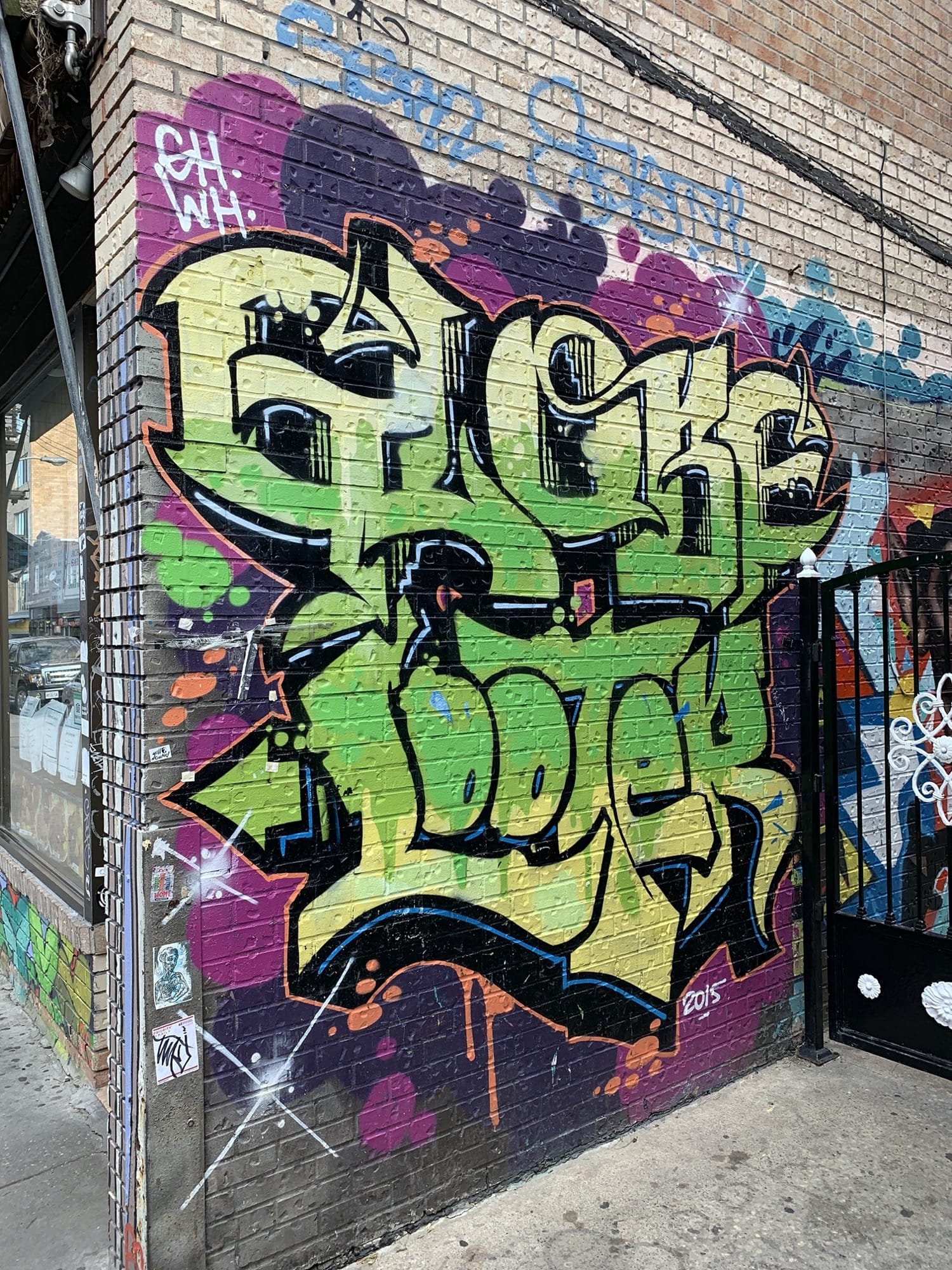L’oeuvre est de type graffiti. Vous pouvez l’admirer dans la ville de Toronto en Canada et plus précisément ici : 184 Baldwin St, Toronto, ON M5T 1L8, Canada.