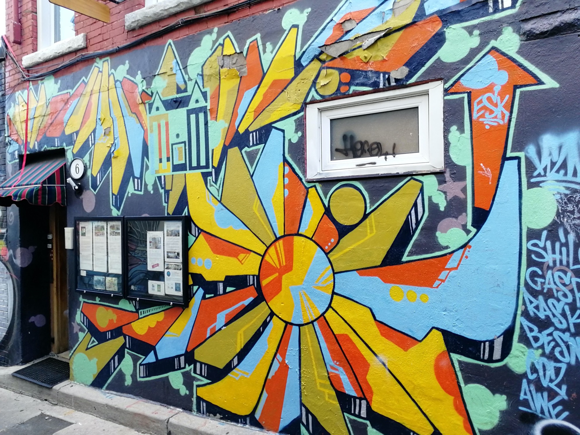 L’oeuvre est de type graffiti. Vous pouvez l’admirer dans la ville de Toronto en Canada et plus précisément ici : 198 Baldwin St, Toronto, ON M5T 1L8, Canada.