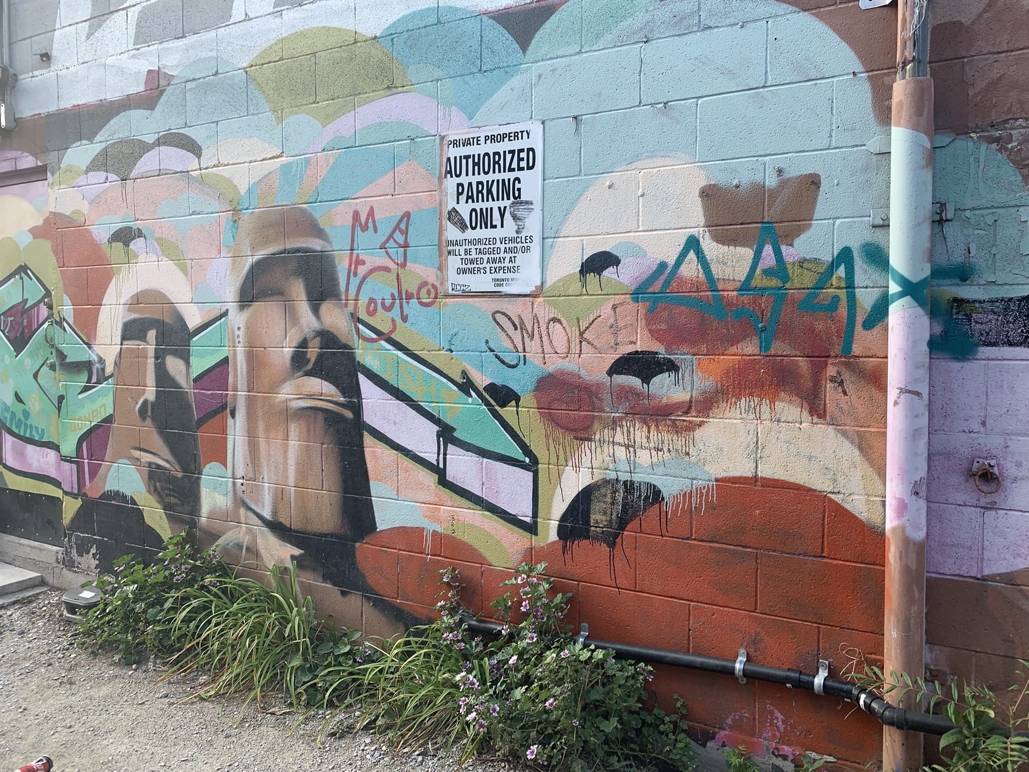 L’oeuvre est de type graffiti. Vous pouvez l’admirer dans la ville de Toronto en Canada et plus précisément ici : 218 Augusta Ave, Toronto, ON M5T 2L8, Canada.
