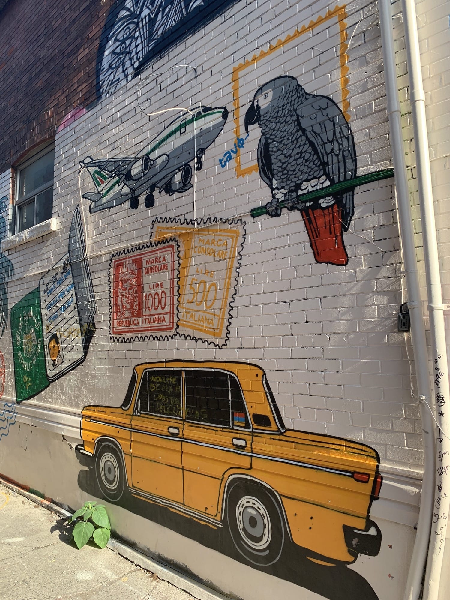 L’oeuvre est de type graffiti. Vous pouvez l’admirer dans la ville de Toronto en Canada et plus précisément ici : 275 Augusta Ave, Toronto, ON M5T 2M1, Canada.