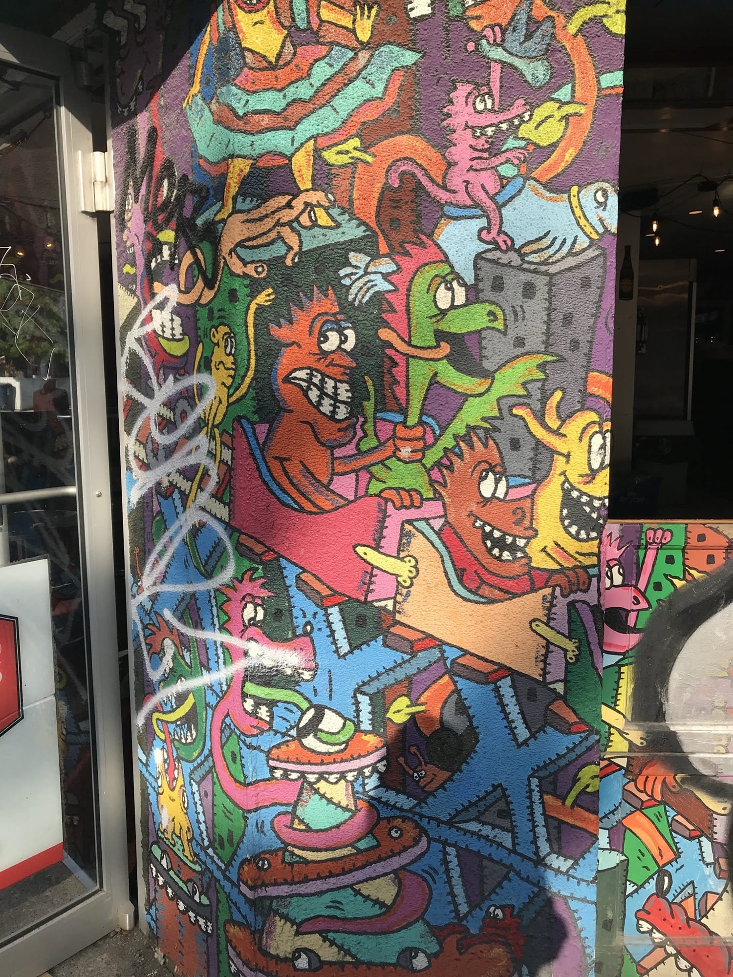 L’oeuvre est de type graffiti. Vous pouvez l’admirer dans la ville de Toronto en Canada et plus précisément ici : 285 Augusta Ave, Toronto, ON M5T 2M1, Canada.