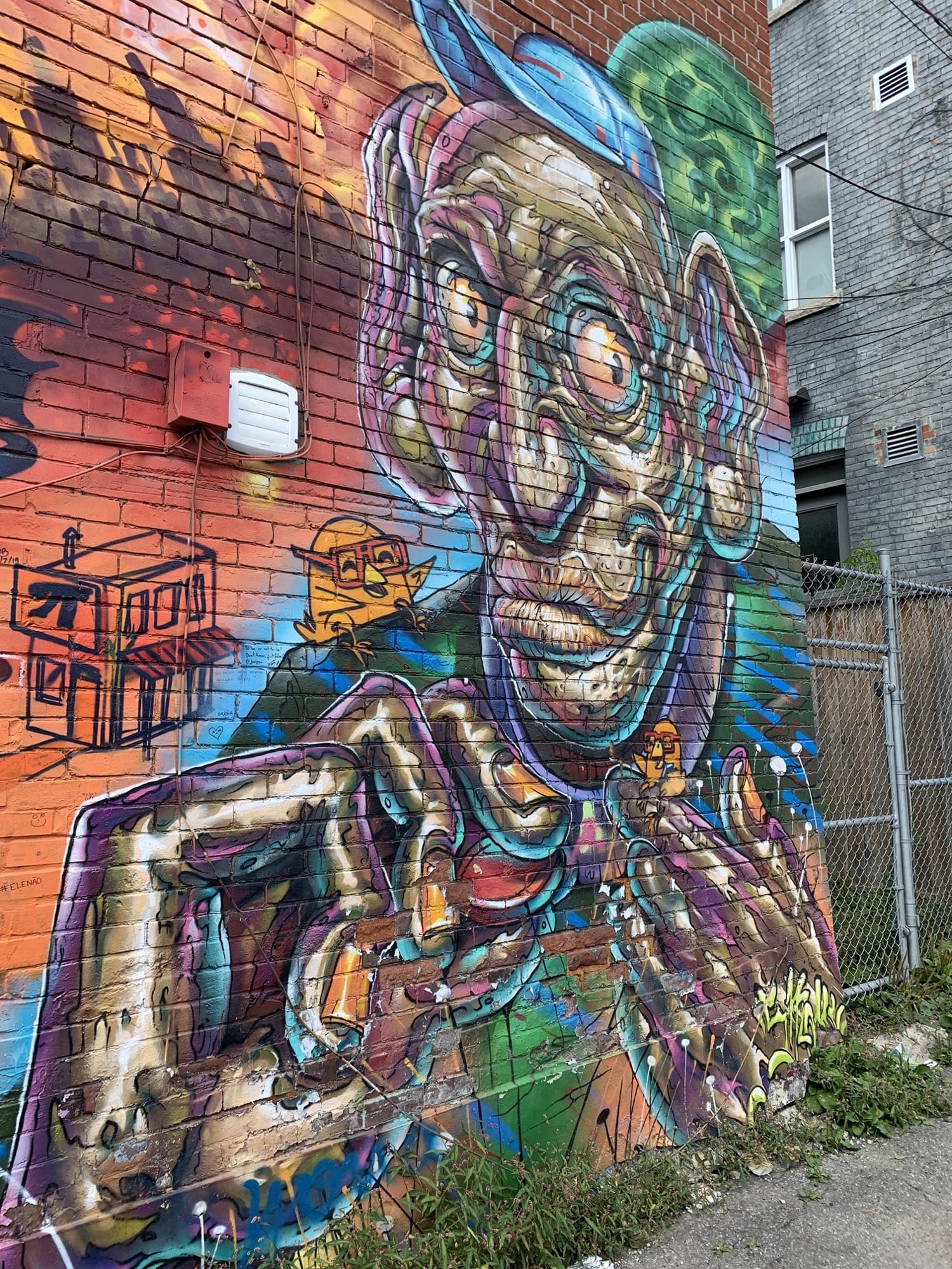 L’oeuvre est de type graffiti. Vous pouvez l’admirer dans la ville de Toronto en Canada et plus précisément ici : 520 Richmond St W, Toronto, ON M5V 1Y4, Canada.