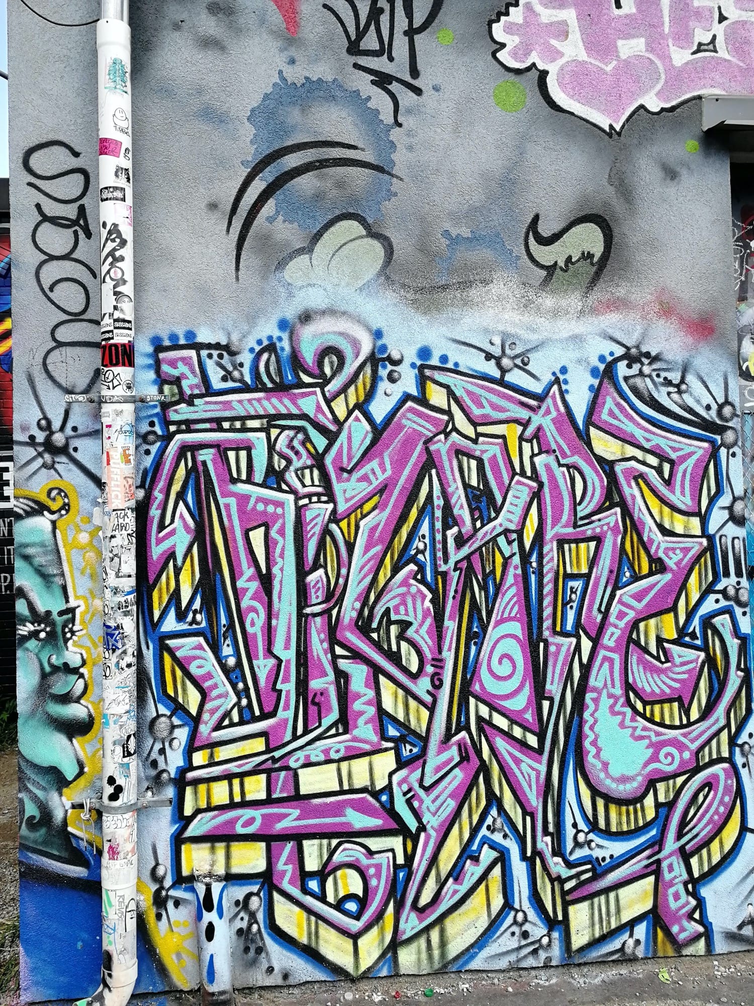 L’oeuvre est de type graffiti. Vous pouvez l’admirer dans la ville de Toronto en Canada et plus précisément ici : 545 Queen St W, Toronto, ON M5V 2B6, Canada.