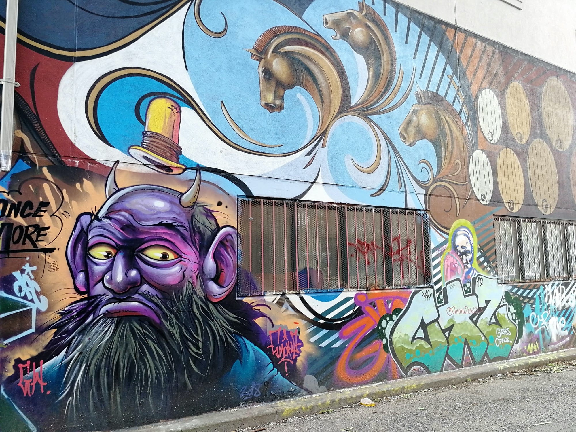 L’oeuvre est de type graffiti. Vous pouvez l’admirer dans la ville de Toronto en Canada et plus précisément ici : 5 Augusta Ave, Toronto, ON M5V 2W1, Canada.