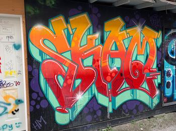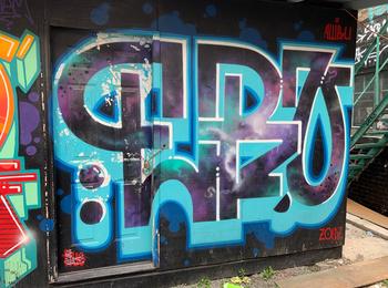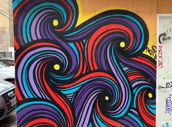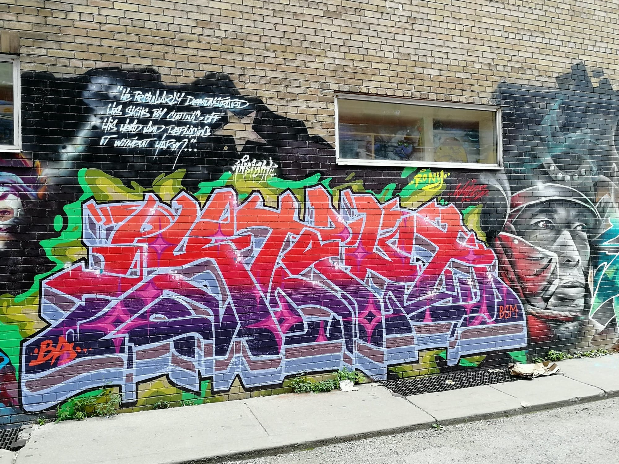 L’oeuvre est de type graffiti. Vous pouvez l’admirer dans la ville de Toronto en Canada et plus précisément ici : 485 Queen St W, Toronto, ON M5V 2A9, Canada.