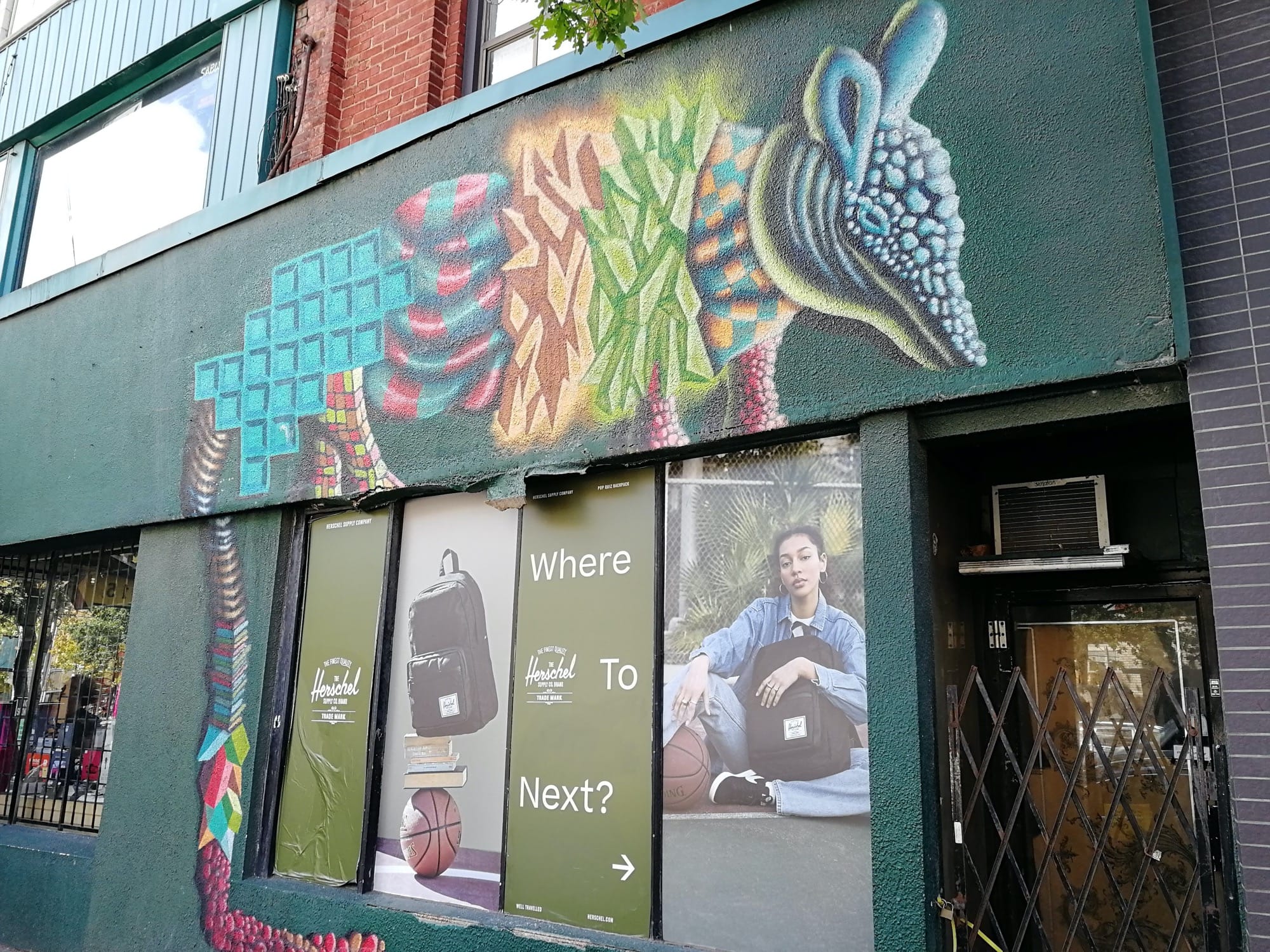L’oeuvre est de type graffiti. Vous pouvez l’admirer dans la ville de Toronto en Canada et plus précisément ici : 421 Queen St W, Toronto, ON M5V 2A5, Canada.