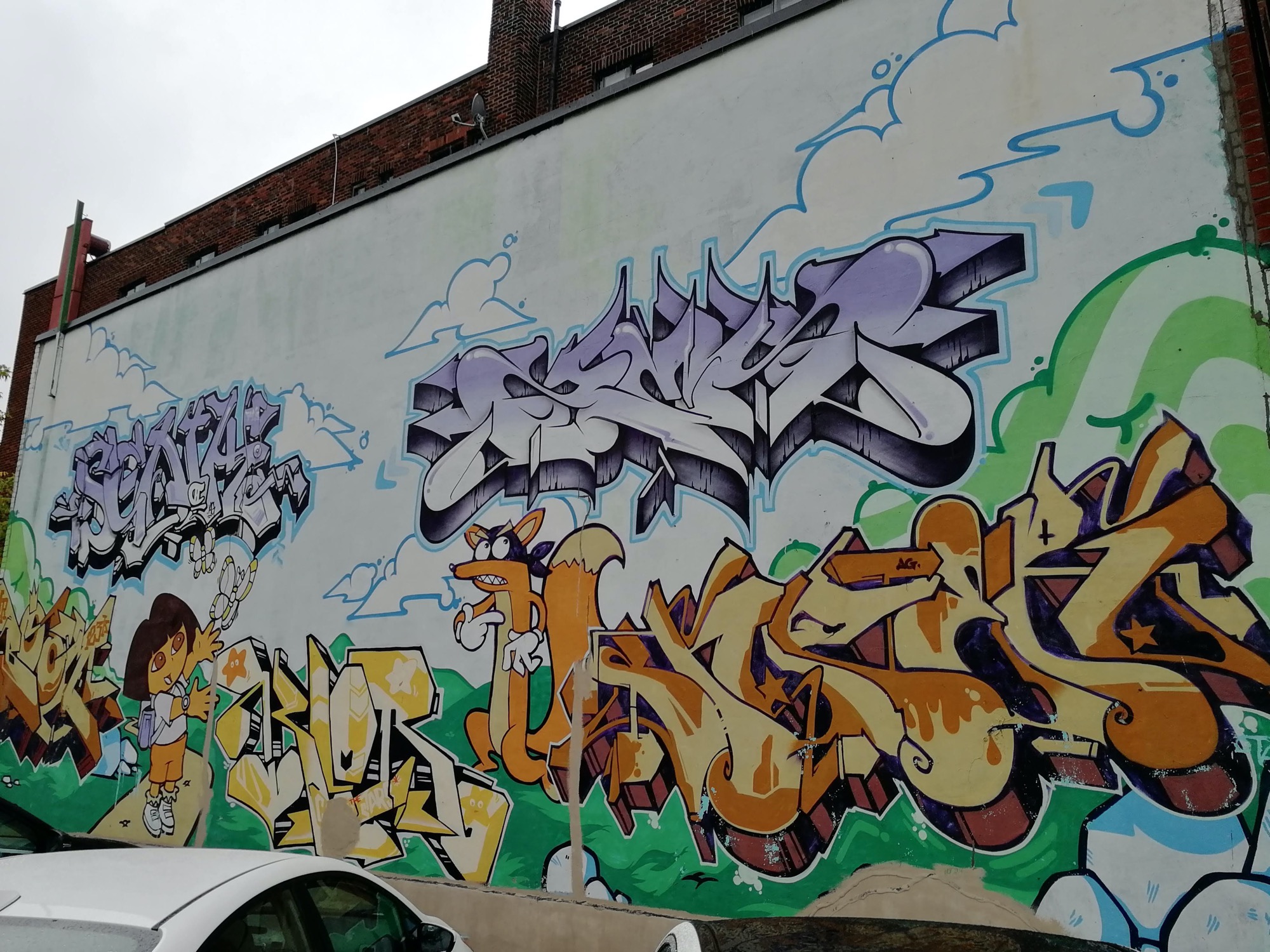 L’oeuvre est de type graffiti. Vous pouvez l’admirer dans la ville de Montréal en Canada et plus précisément ici : 5200 Boulevard Décarie, Montréal, QC H3X 3Z6, Canada.