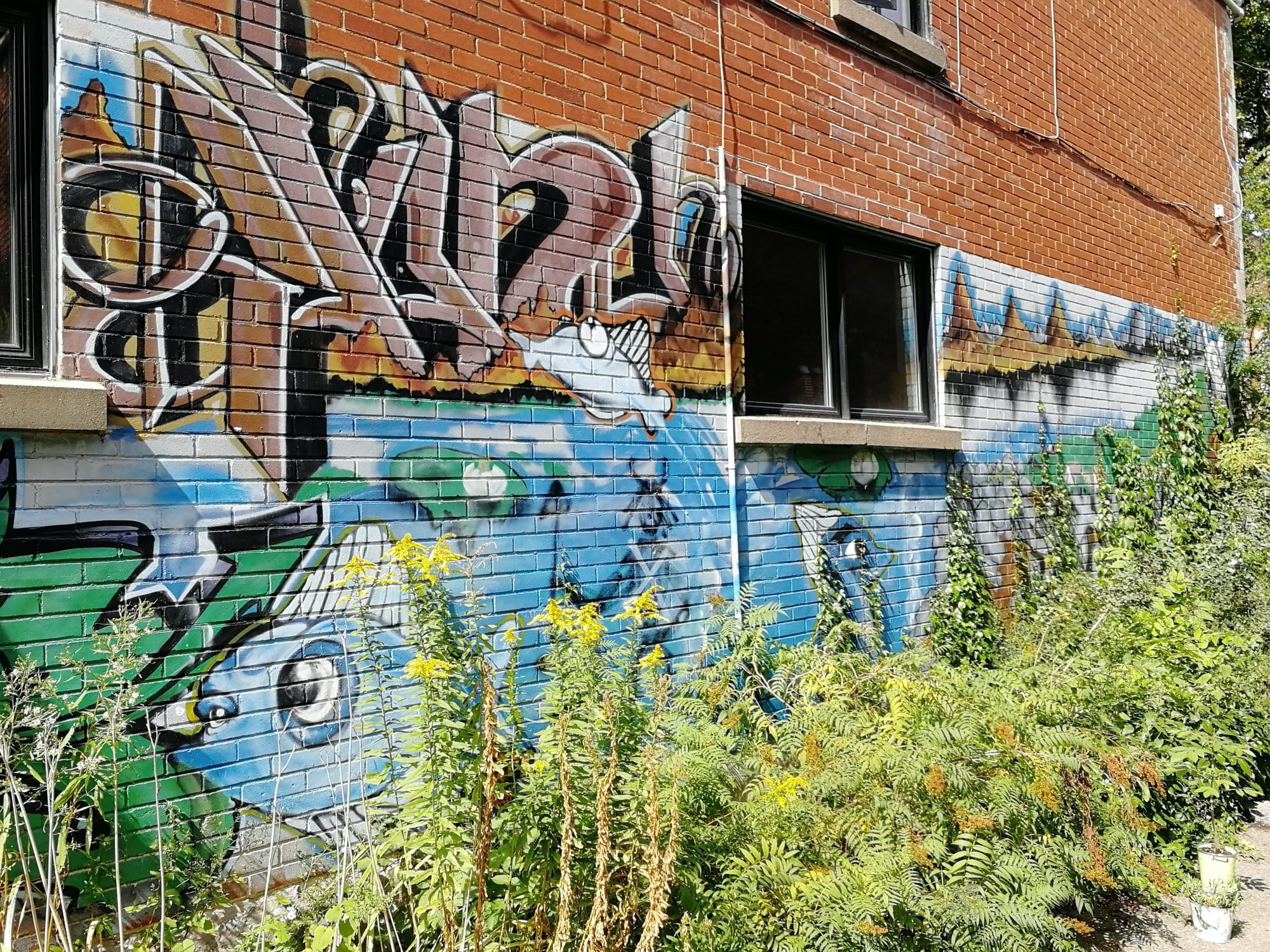 L’oeuvre est de type graffiti. Vous pouvez l’admirer dans la ville de Montréal en Canada et plus précisément ici : 4683 Rue Adam, Montréal, QC H1V 1V4, Canada.