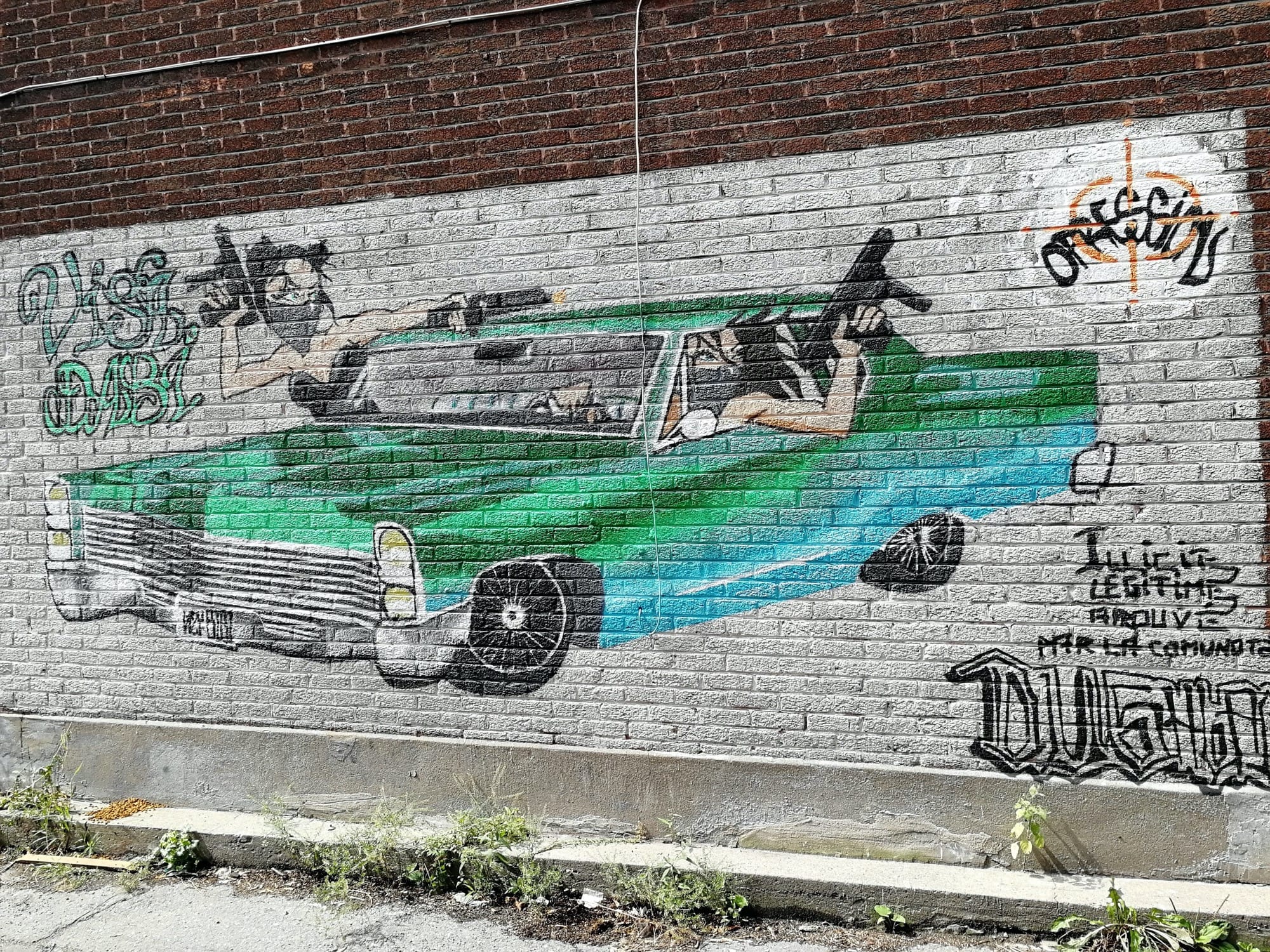 L’oeuvre est de type graffiti. Vous pouvez l’admirer dans la ville de Montréal en Canada et plus précisément ici : 1430 Avenue Aird, Montréal, QC H1V 2V3, Canada.