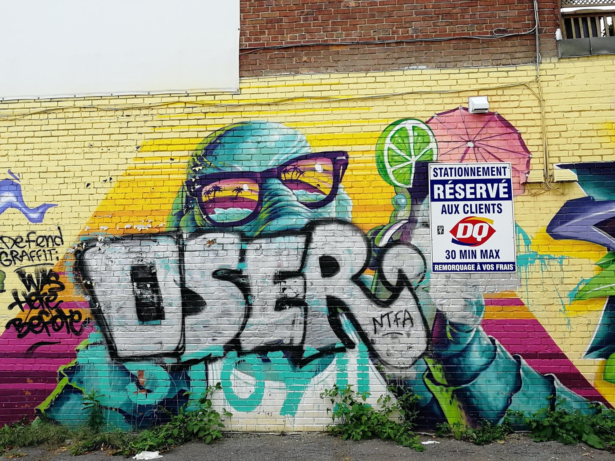 L’oeuvre est de type graffiti. Vous pouvez l’admirer dans la ville de Montréal en Canada et plus précisément ici : 4491 Rue Sainte-Catherine E, Montréal, QC H1V 1Y6, Canada.
