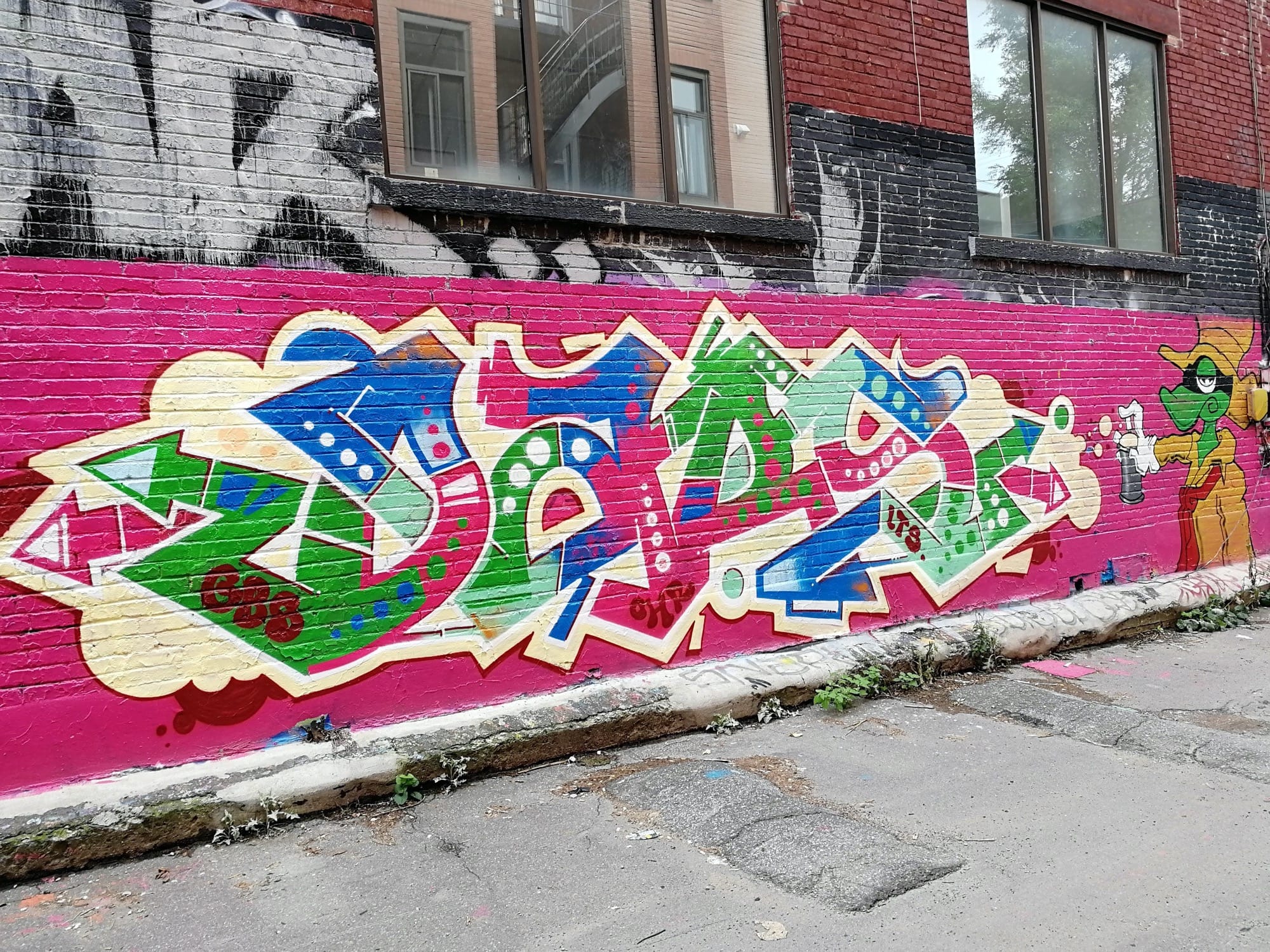 L’oeuvre est de type graffiti. Vous pouvez l’admirer dans la ville de Montréal en Canada et plus précisément ici : 4277 Rue Sainte-Catherine E, Montréal, QC H1V 1Y1, Canada.