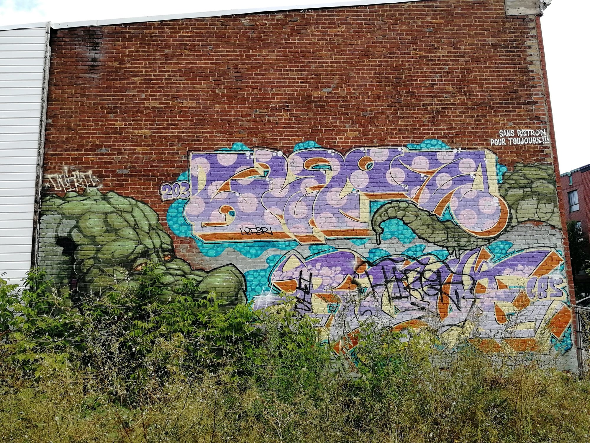L’oeuvre est de type graffiti. Vous pouvez l’admirer dans la ville de Montréal en Canada et plus précisément ici : 2335 Rue Ontario E, Montréal, QC H2K 1W2, Canada.