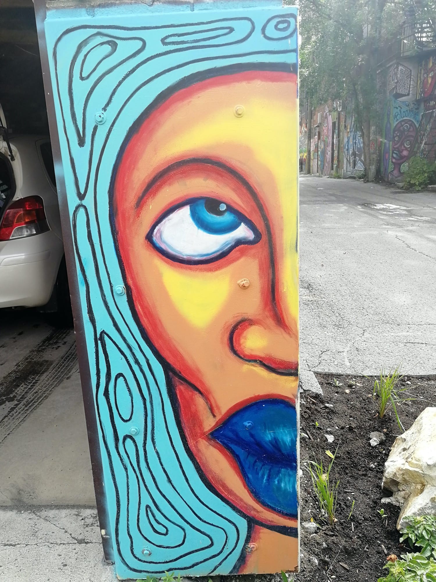 L’oeuvre est de type graffiti. Vous pouvez l’admirer dans la ville de Montréal en Canada et plus précisément ici : 4472 D Rue de la Roche, Montréal, QC H2J 3J1, Canada.