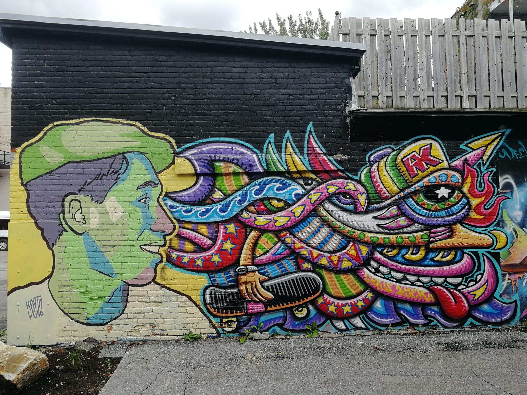 L’oeuvre est de type graffiti. Vous pouvez l’admirer dans la ville de Montréal en Canada et plus précisément ici : 4484 B Rue de la Roche, Montréal, QC H2J 3J1, Canada.