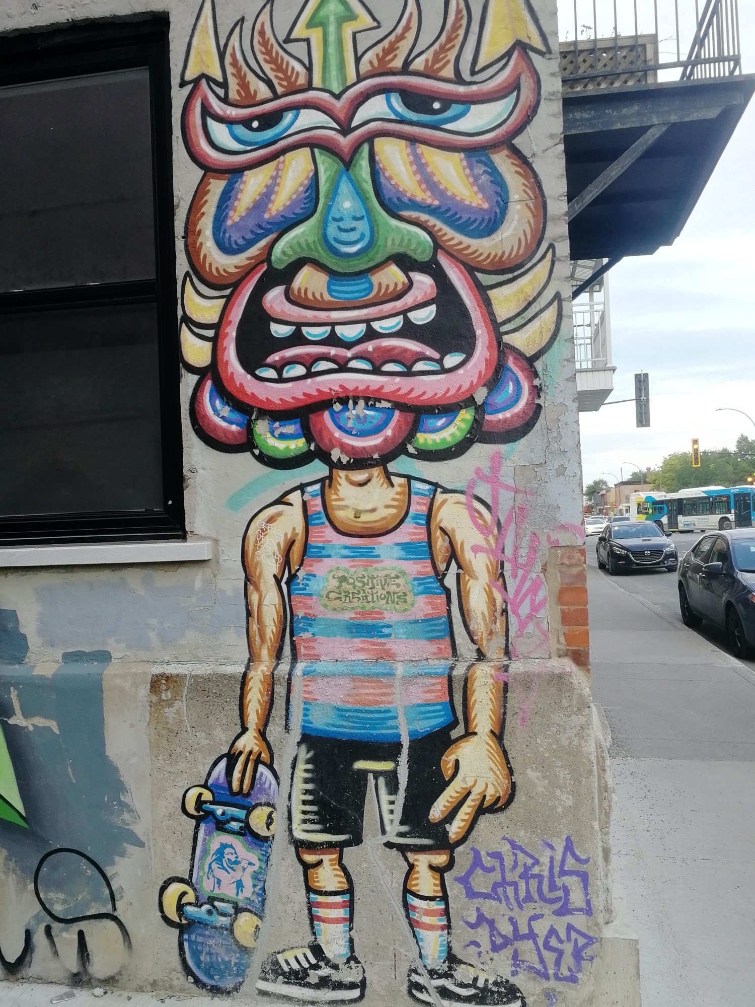 L’oeuvre est de type graffiti. Vous pouvez l’admirer dans la ville de Montréal en Canada et plus précisément ici : 357 Rue de Bellechasse, Montréal, QC H2S 1X1, Canada.