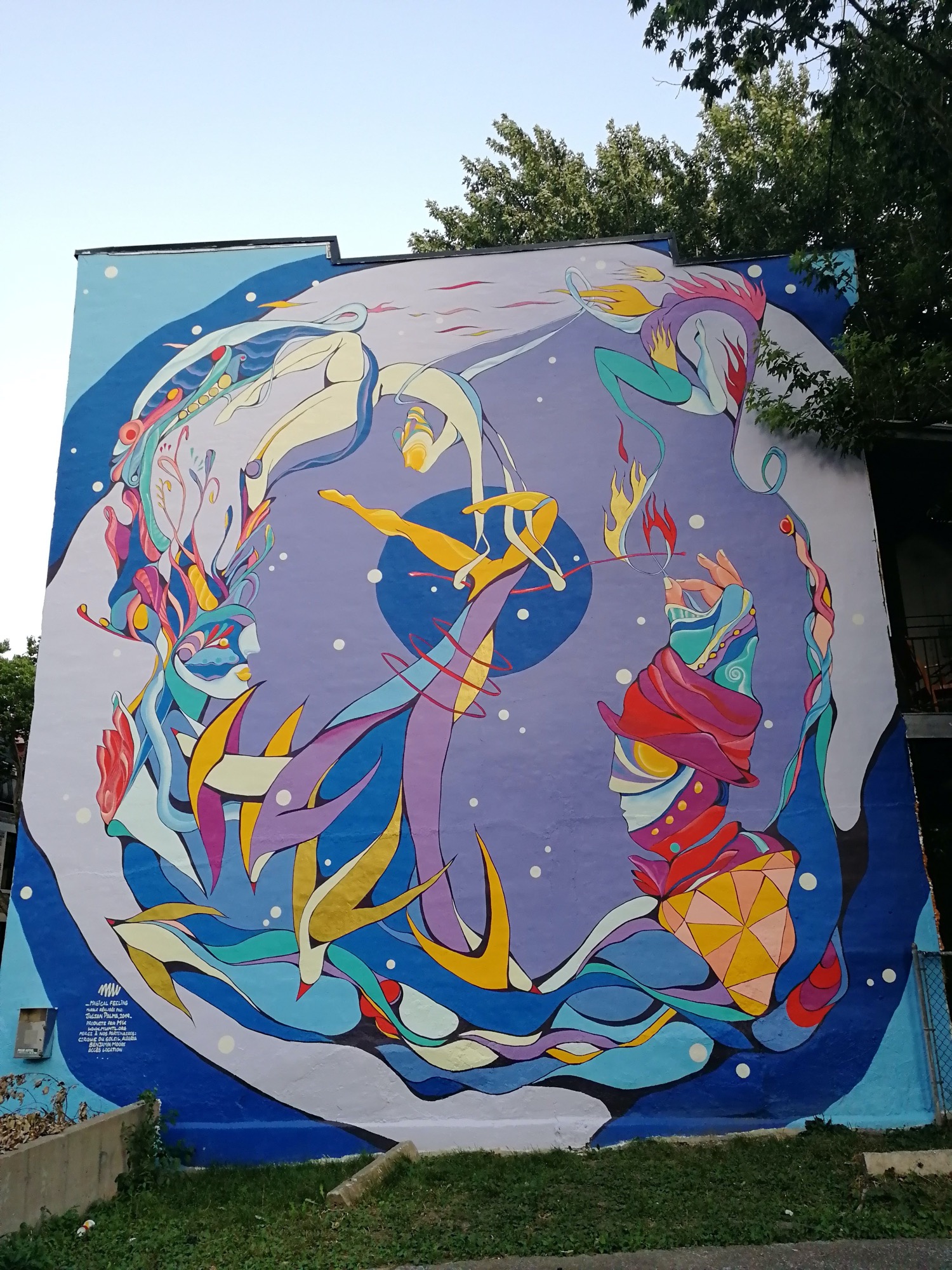 L’oeuvre est de type graffiti. Vous pouvez l’admirer dans la ville de Montréal en Canada et plus précisément ici : 830 Rue Sainte-Catherine E, Montréal, QC H2L 2E2, Canada.