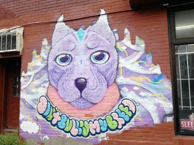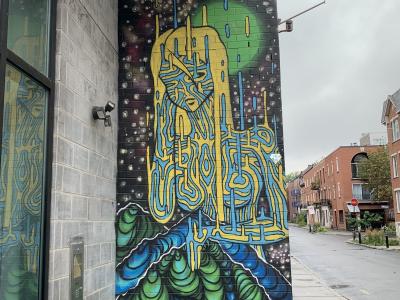 L'oeuvre est de type graffiti. Vous pouvez l'admirer dans la ville de Montréal en Canada et plus précisément ici : 87 Rue Roy E, Montréal, QC H2W 1L8, Canada.