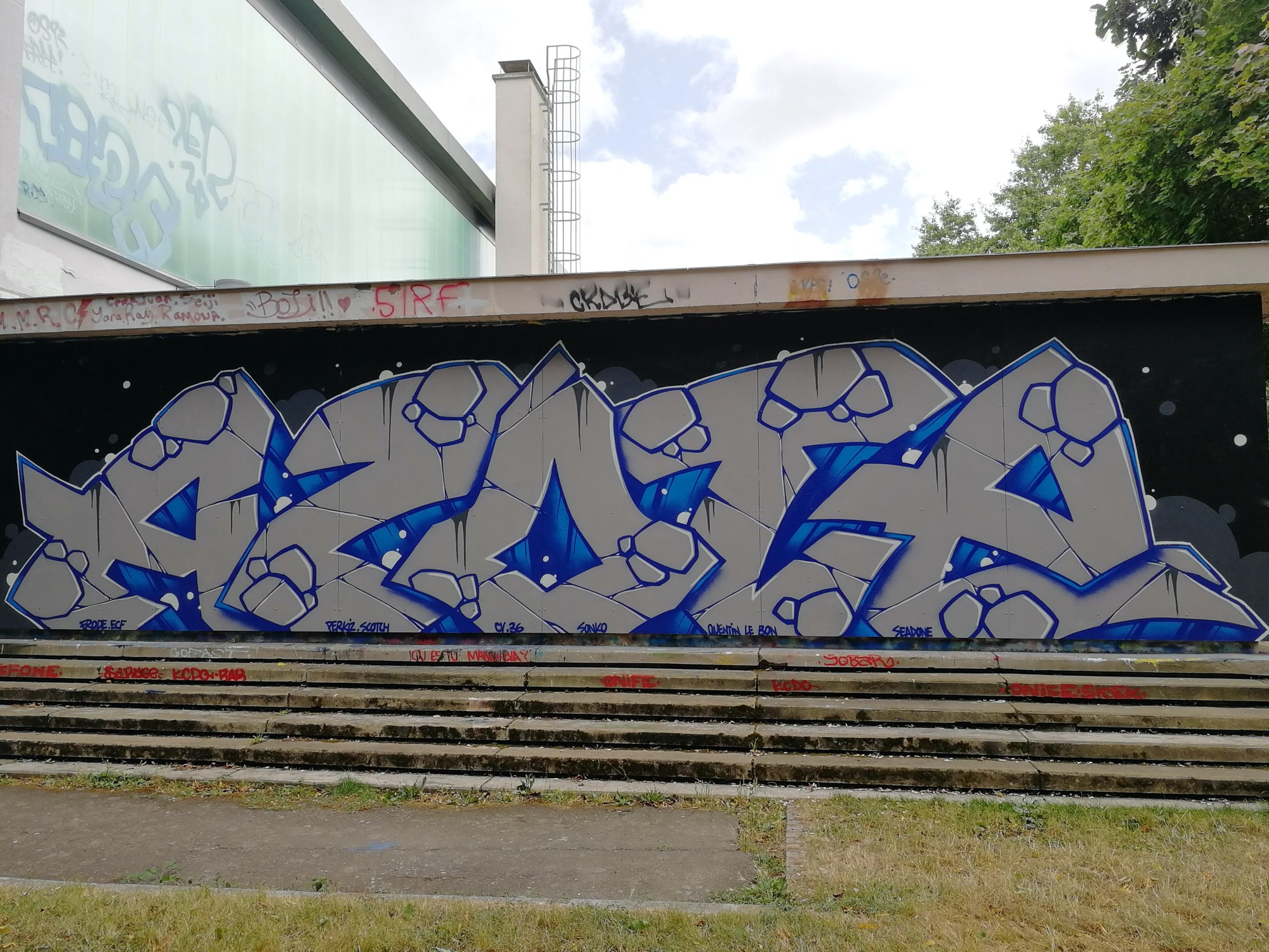 L’oeuvre est de type graffiti. Vous pouvez l’admirer dans la ville de Rennes en France et plus précisément ici : 14 Square Yves Montand, 35000 Rennes, France.