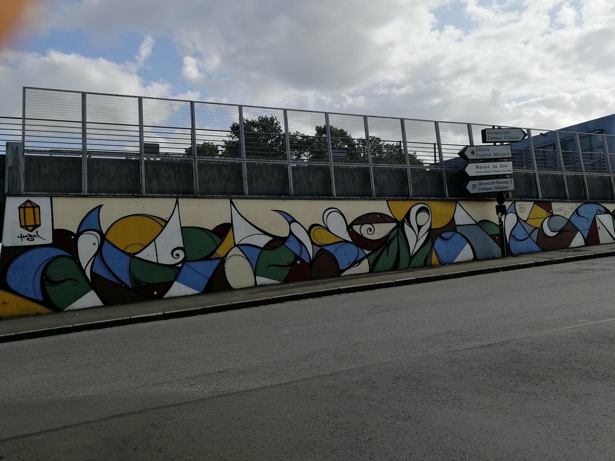 L’oeuvre est de type graffiti. Vous pouvez l’admirer dans la ville de Rennes en France et plus précisément ici : 7 Rue Pierre Jean Gineste, 35000 Rennes, France.