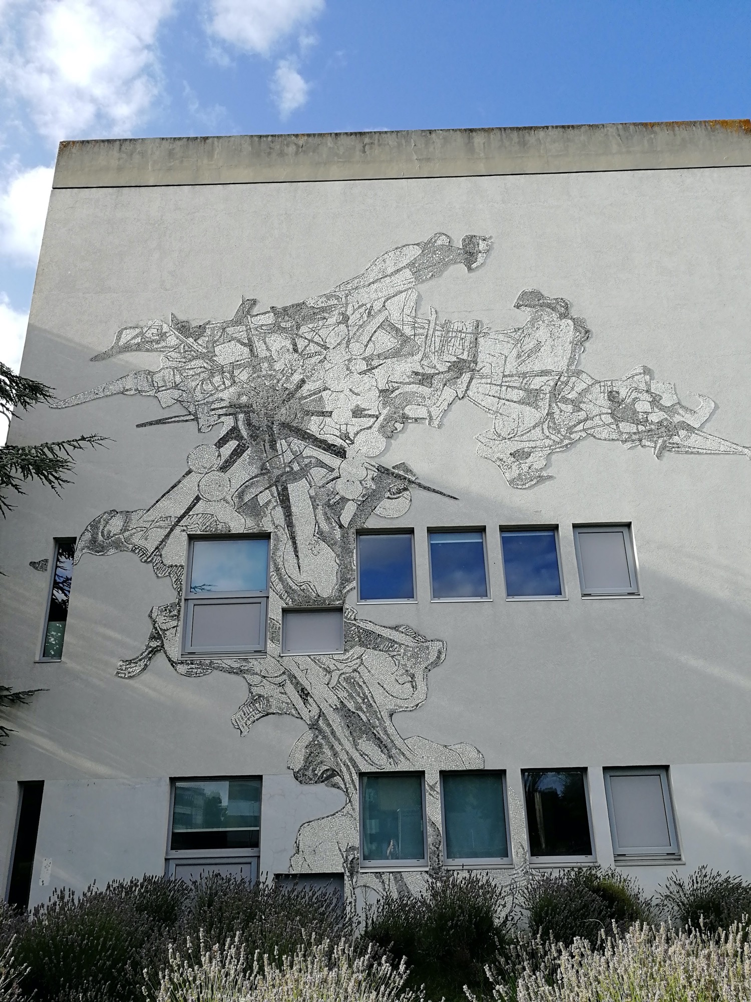 L’oeuvre est de type graffiti. Vous pouvez l’admirer dans la ville de Rennes en France et plus précisément ici : Bâtiment E, 35000 Rennes, France.