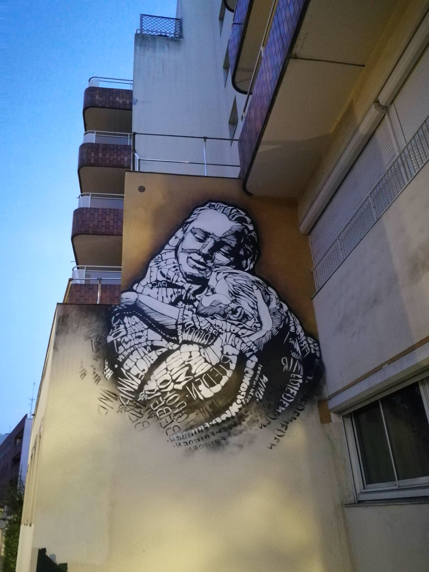 L’oeuvre est de type graffiti. Vous pouvez l’admirer dans la ville de Paris en France et plus précisément ici : 7 Rue du Dr Victor Hutinel, 75013 Paris, France.