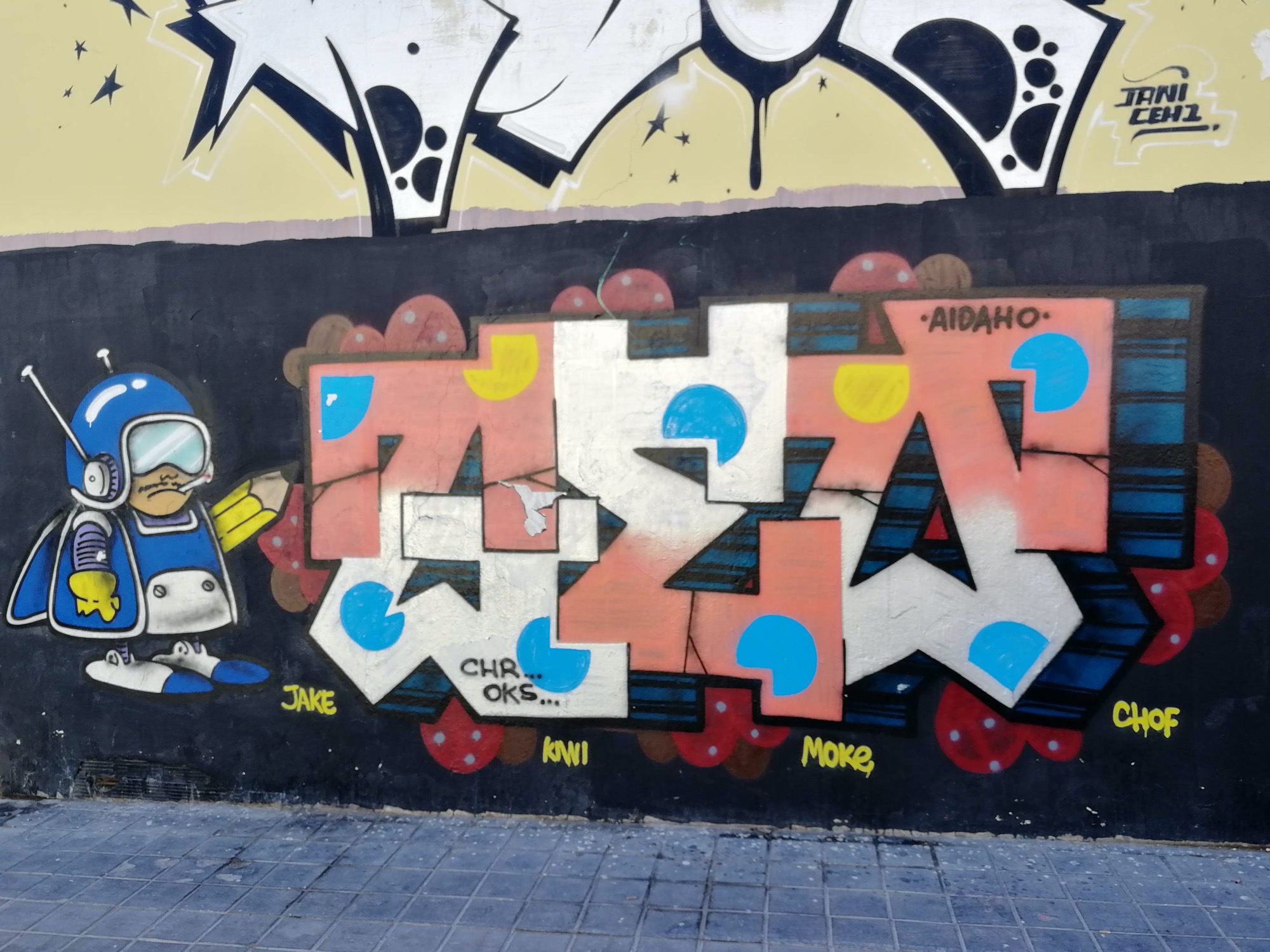 L’oeuvre est de type graffiti. Vous pouvez l’admirer dans la ville de València en Spain et plus précisément ici : Carrer Poeta Francesc Caballé, 11, 46017 València, Valencia, Espagne.