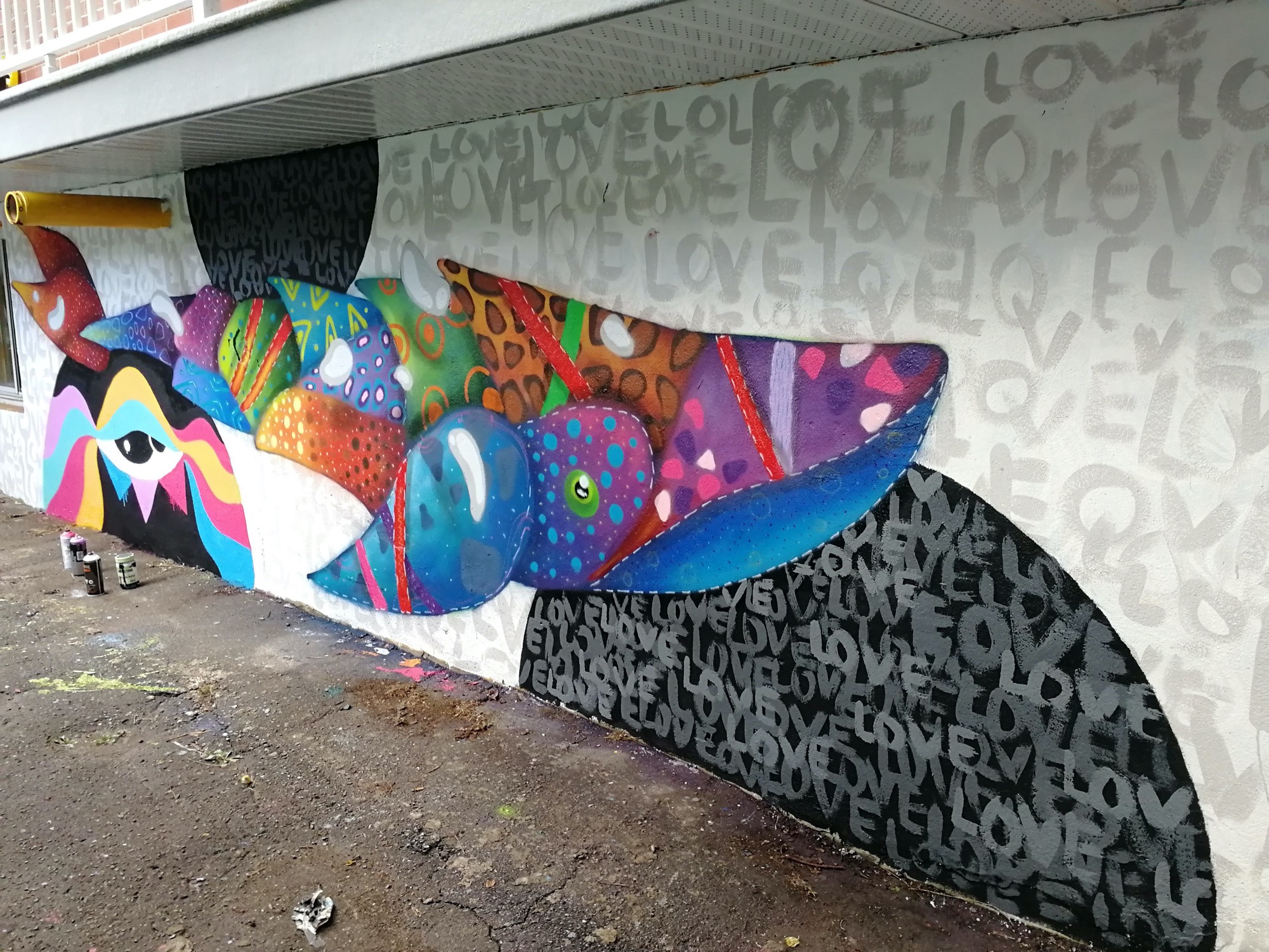 L’oeuvre est de type graffiti. Vous pouvez l’admirer dans la ville de Montréal en Canada et plus précisément ici : 2940 Avenue Laurier E, Montréal, QC H1Y 1Z4, Canada.
