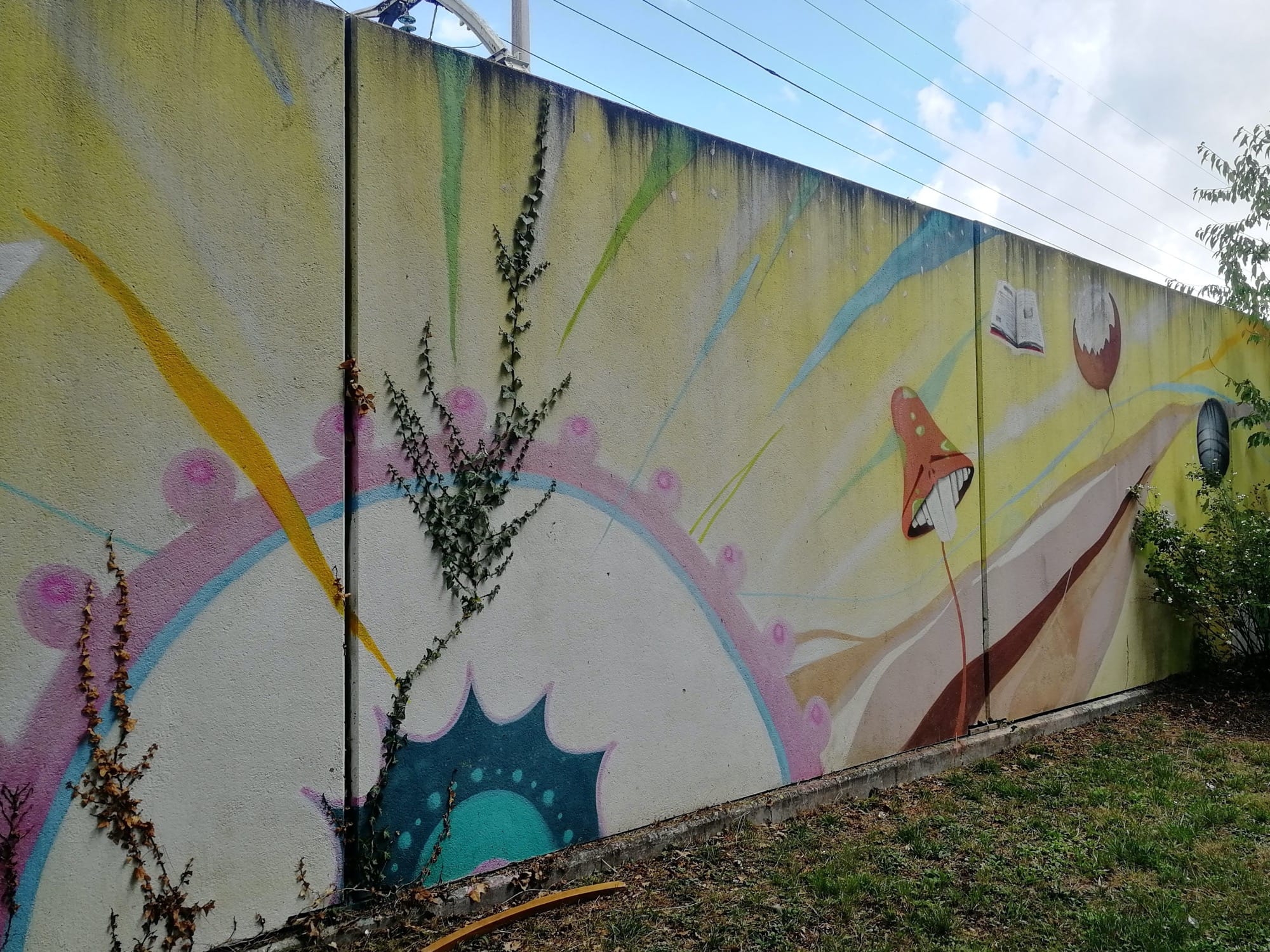 L’oeuvre est de type graffiti. Vous pouvez l’admirer dans la ville de Pessac en France et plus précisément ici : 5 Allée des Cigales, 33600 Pessac, France.
