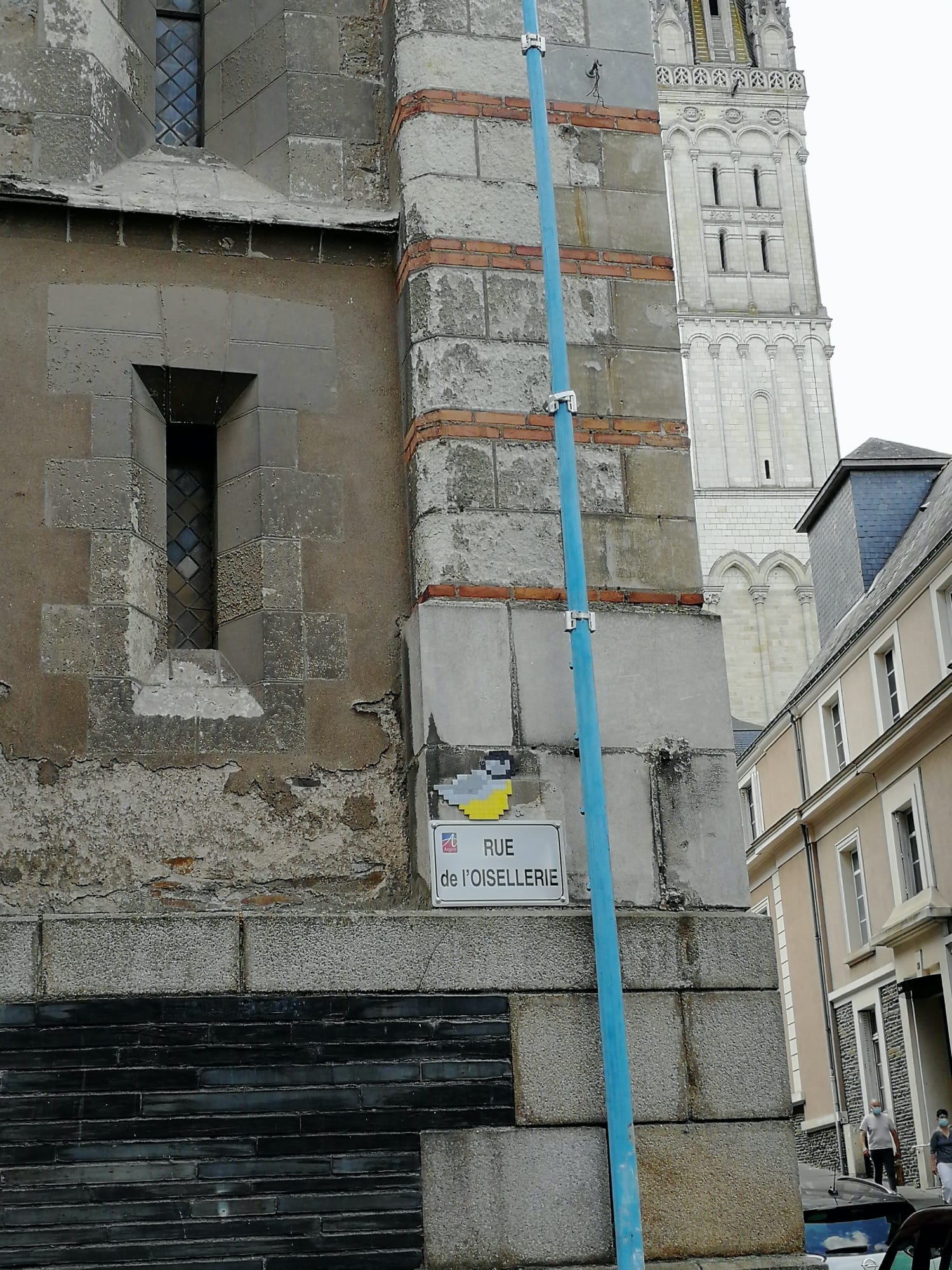 L’oeuvre est de type sticking. Vous pouvez l’admirer dans la ville de Angers en France et plus précisément ici : 76 Rue Baudrière, 49100 Angers, France.