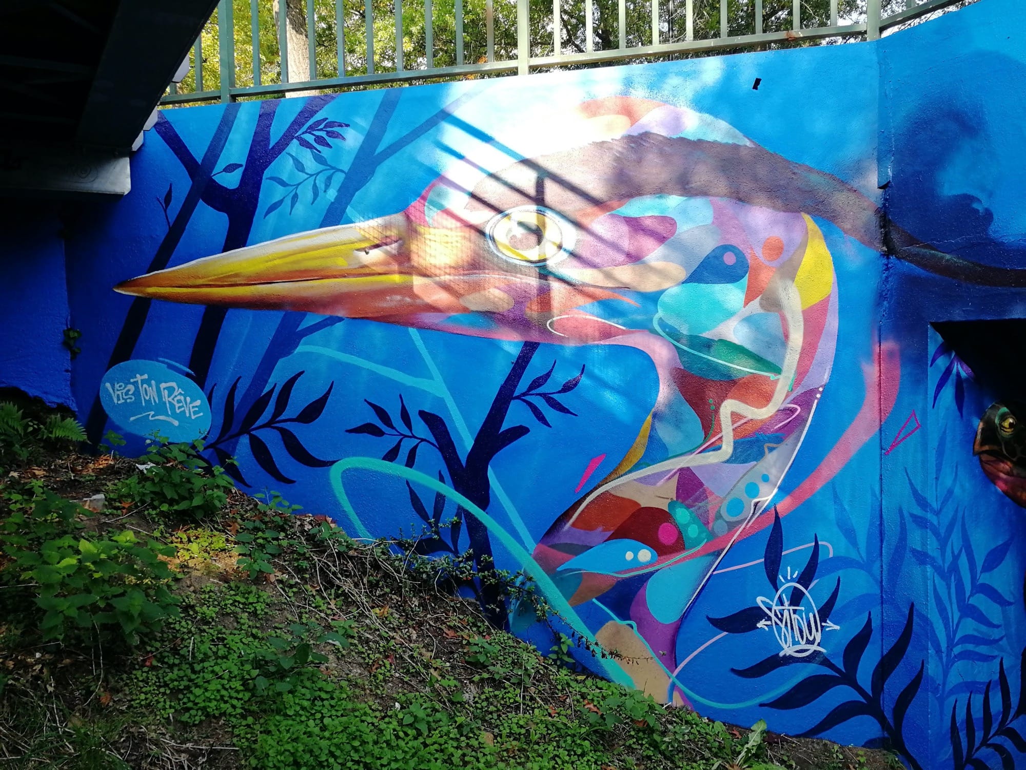 L’oeuvre est de type graffiti. Vous pouvez l’admirer dans la ville de Nantes en France et plus précisément ici : 77 Rue du Port Boyer, 44300 Nantes, France.