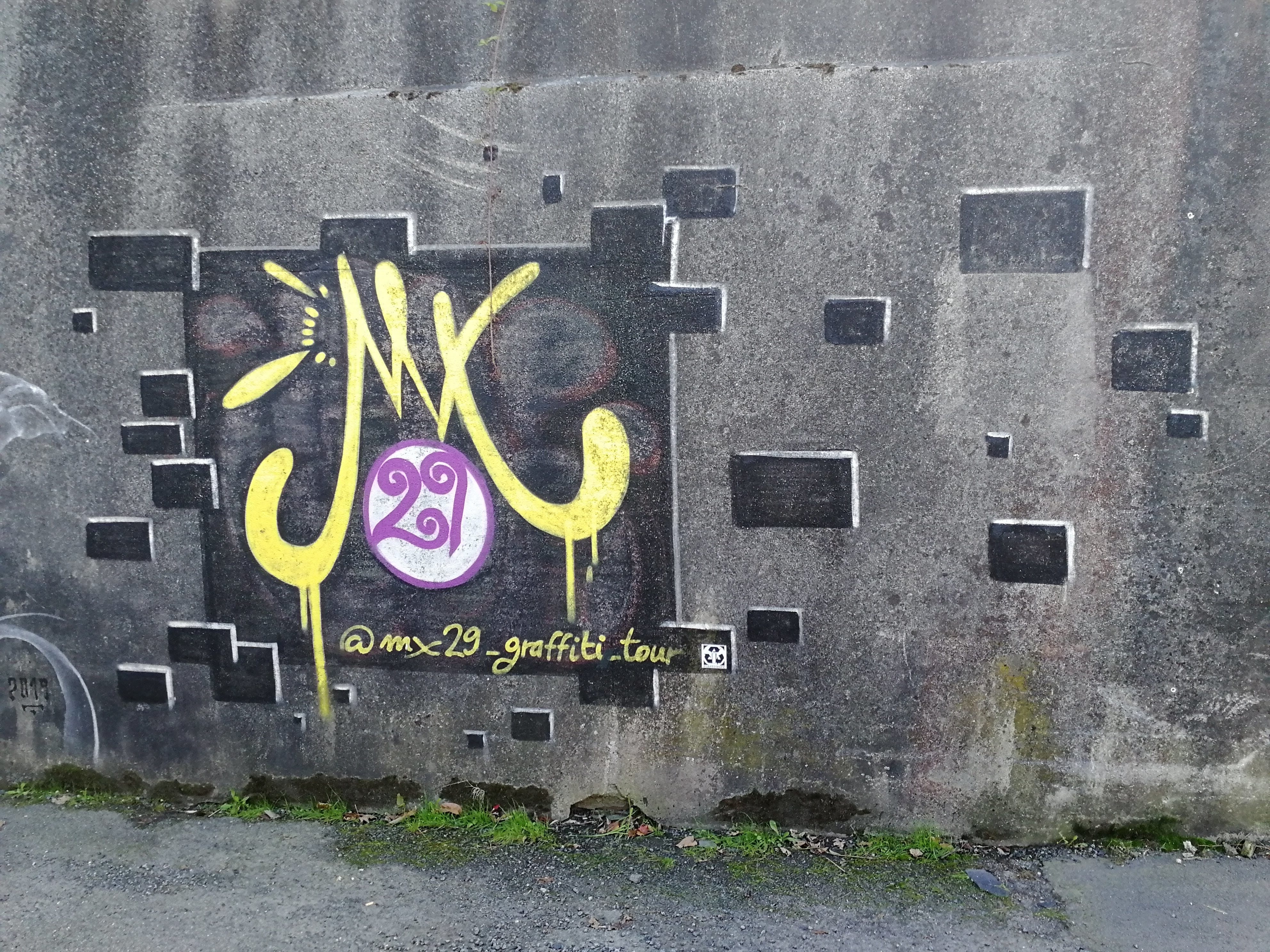 L’oeuvre est de type graffiti. Vous pouvez l’admirer dans la ville de Morlaix en France et plus précisément ici : Gare Sncf, 29600 Morlaix, France.
