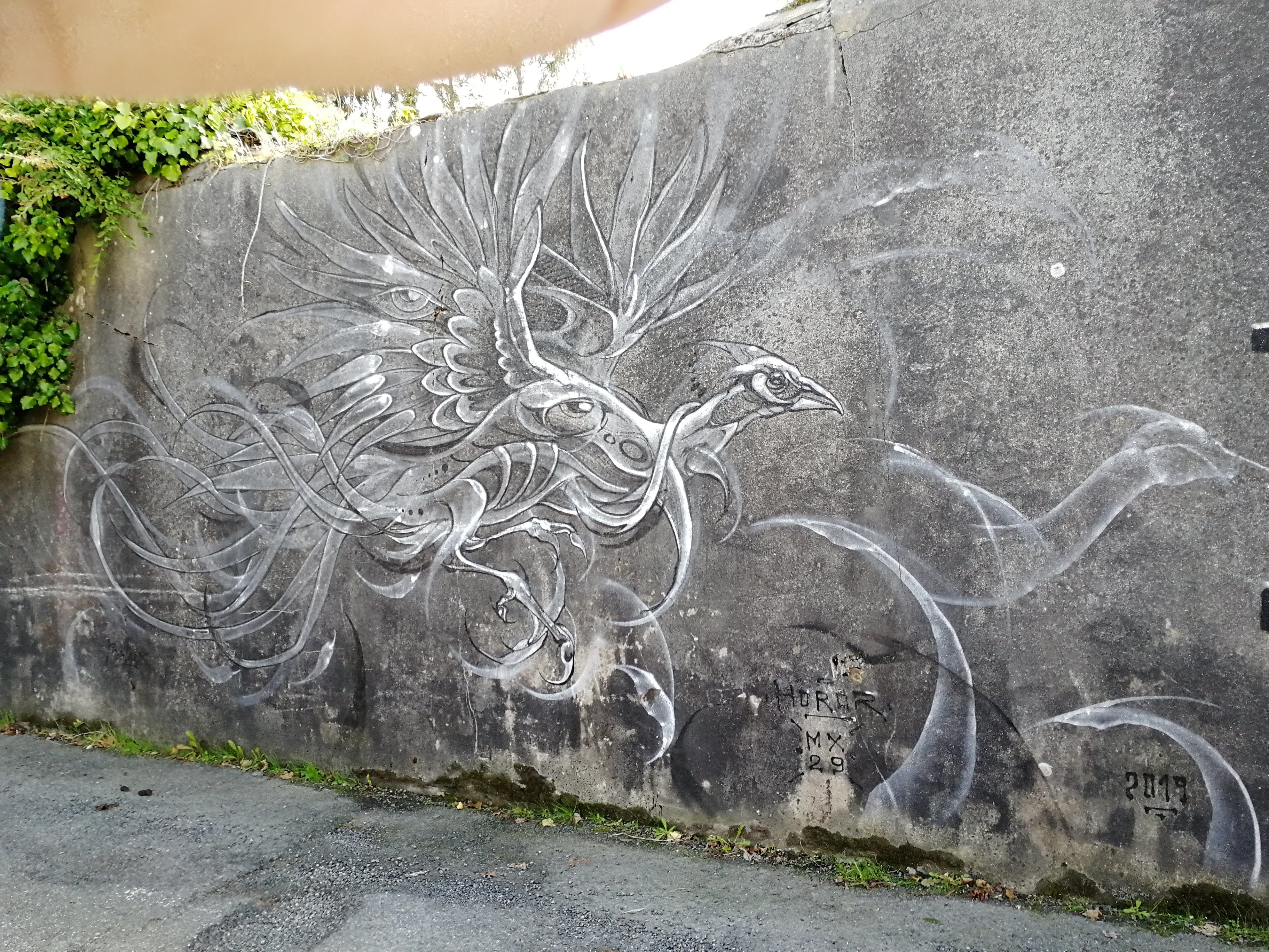 L’oeuvre est de type graffiti. Vous pouvez l’admirer dans la ville de Morlaix en France et plus précisément ici : Gare Sncf, 29600 Morlaix, France.