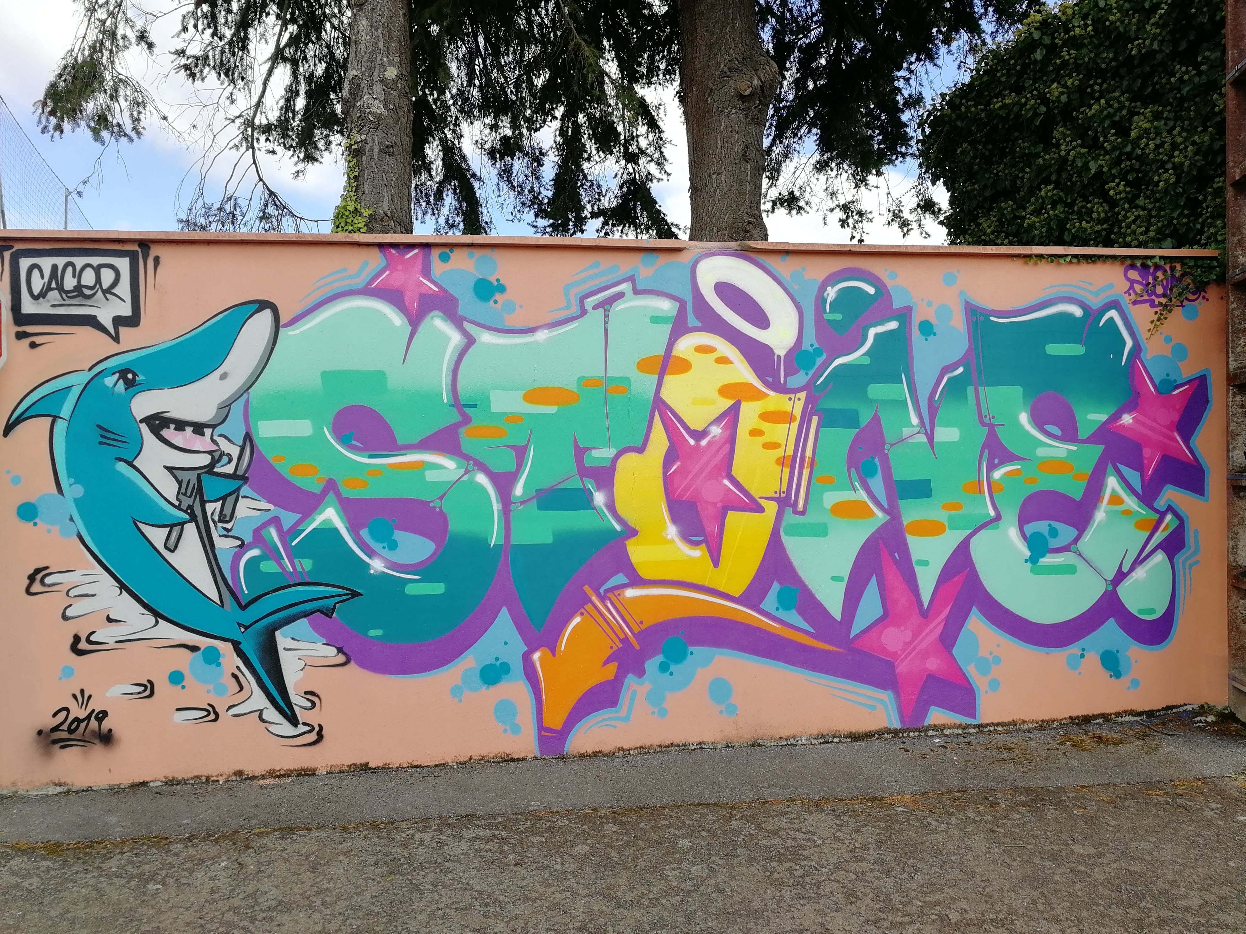 L’oeuvre est de type graffiti. Vous pouvez l’admirer dans la ville de Morlaix en France et plus précisément ici : 15 Rue de Porsmoguer, 29600 Morlaix, France.