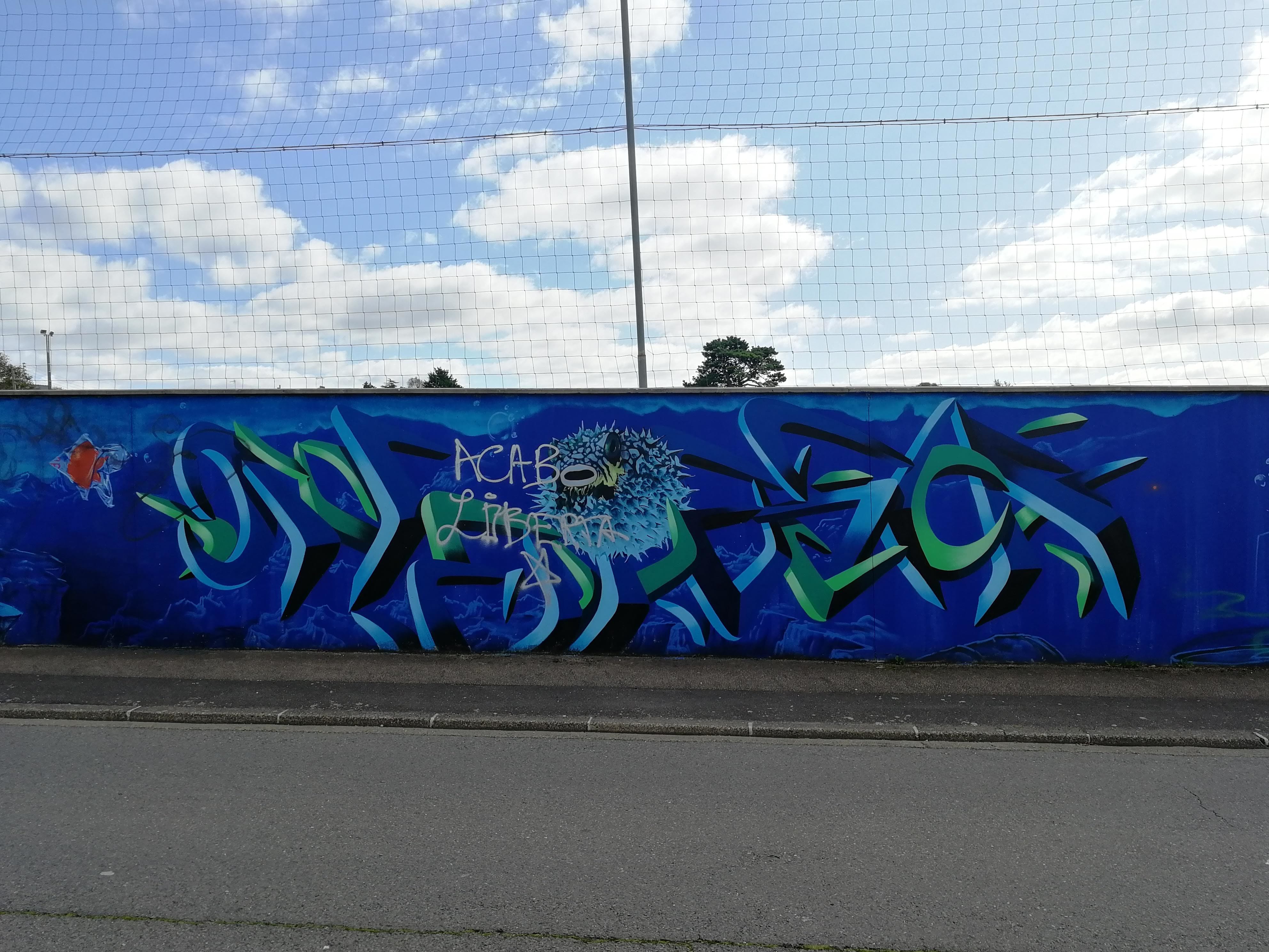 L’oeuvre est de type graffiti. Vous pouvez l’admirer dans la ville de Morlaix en France et plus précisément ici : 16 Rue de la Paix, 29600 Morlaix, France.