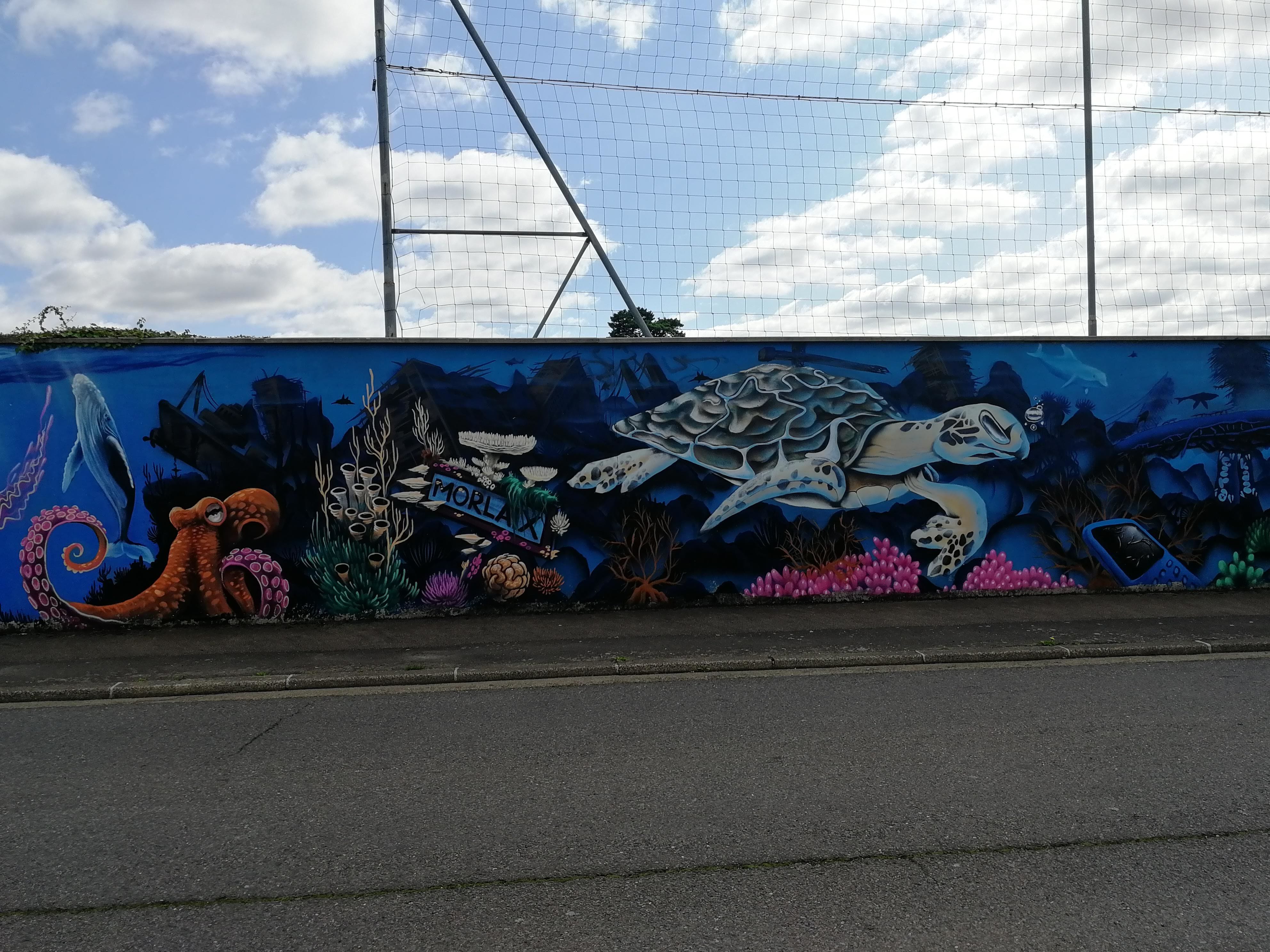 L’oeuvre est de type graffiti. Vous pouvez l’admirer dans la ville de Morlaix en France et plus précisément ici : 20 Rue de la Paix, 29600 Morlaix, France.