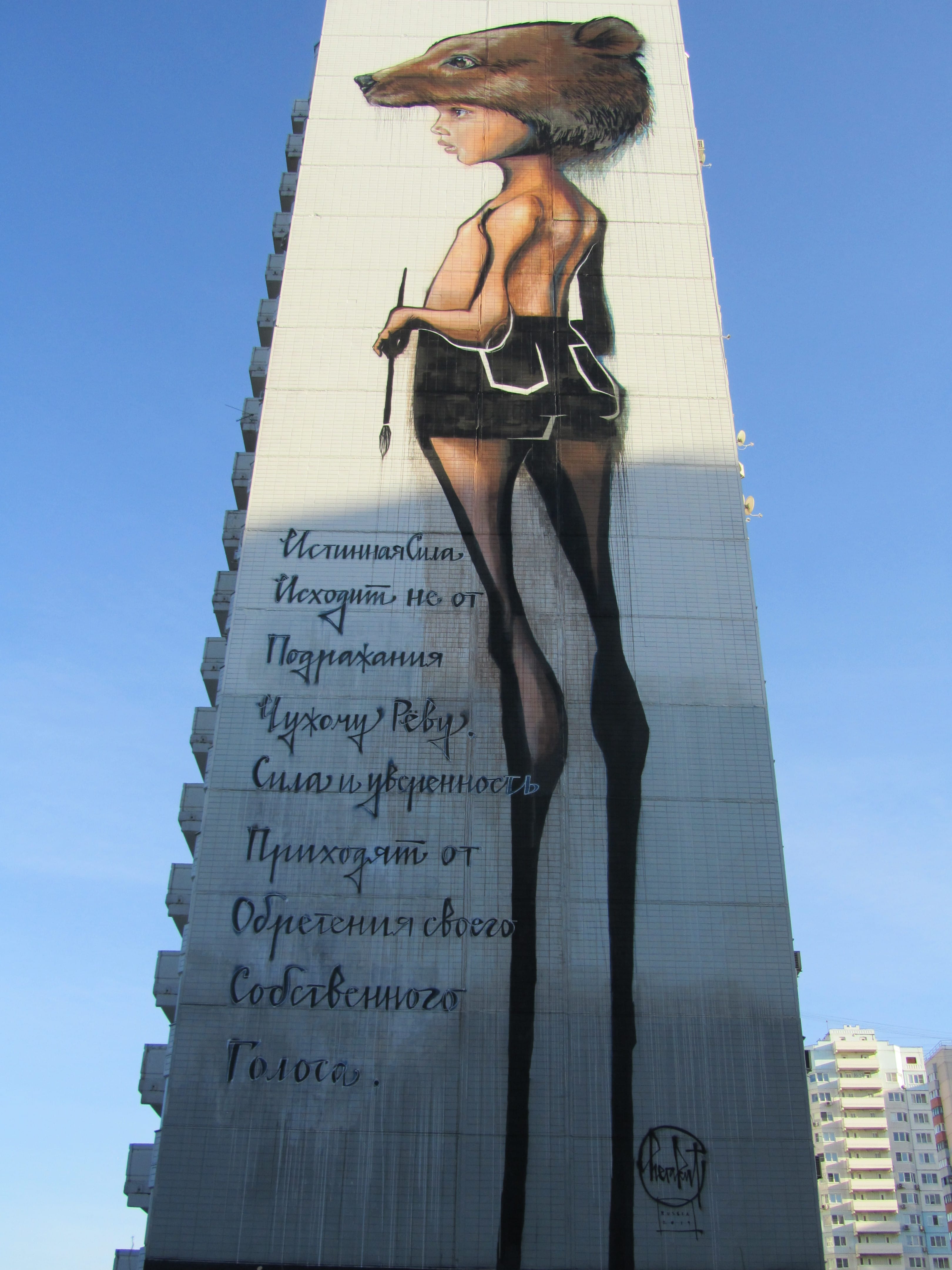 L’oeuvre est de type graffiti. Vous pouvez l’admirer dans la ville de New Tryokhgorka en Russia et plus précisément ici : 33 Kutuzovskaya st., 143083 New Tryokhgorka, Russia.