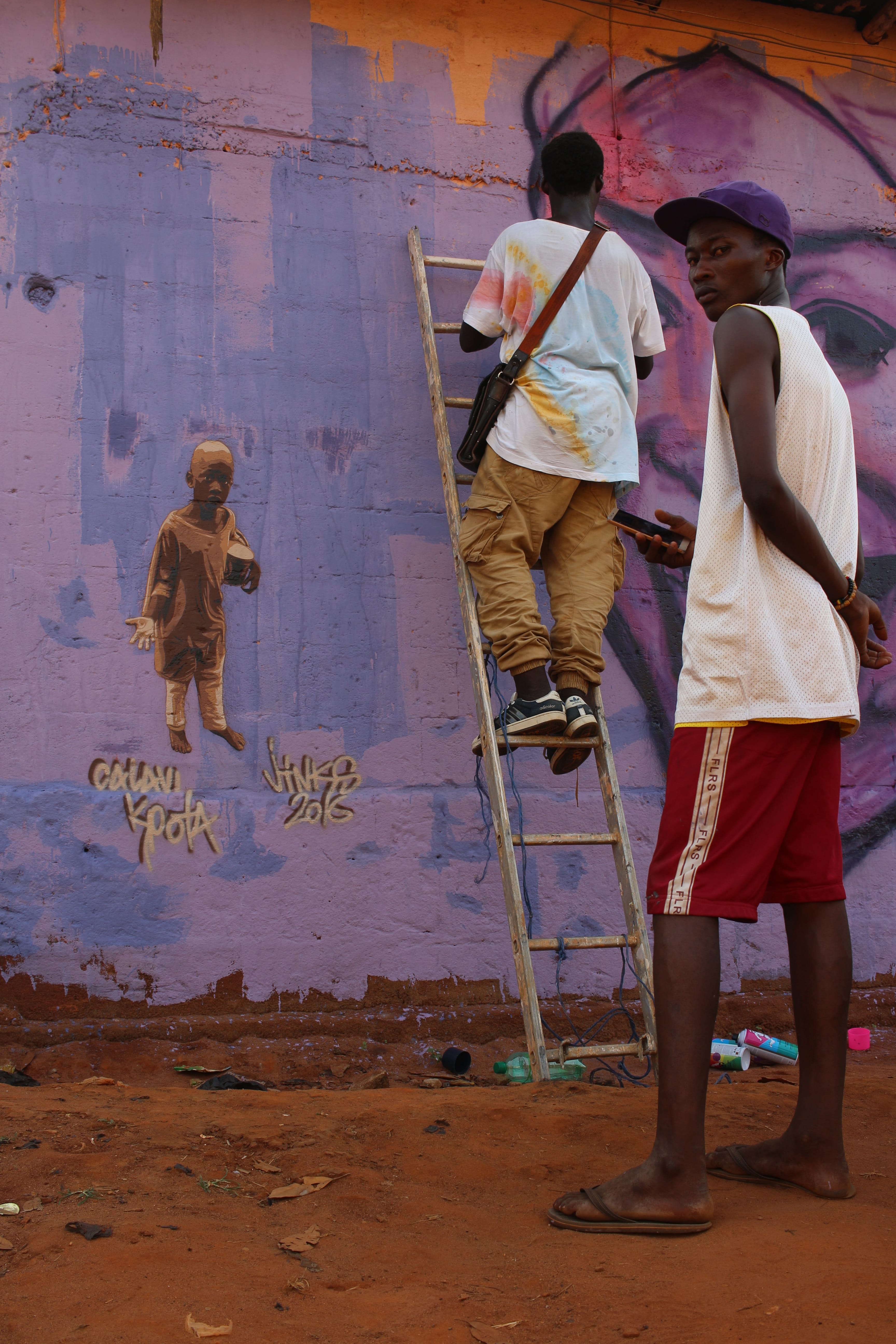 L’oeuvre Talibé est de type graffiti. Vous pouvez l’admirer dans la ville de Abomey Calavi en Benin et plus précisément ici : Godomey, Dèkougbé Von de la boulangerie "Le Salut, Abomey Calavi, Benin.