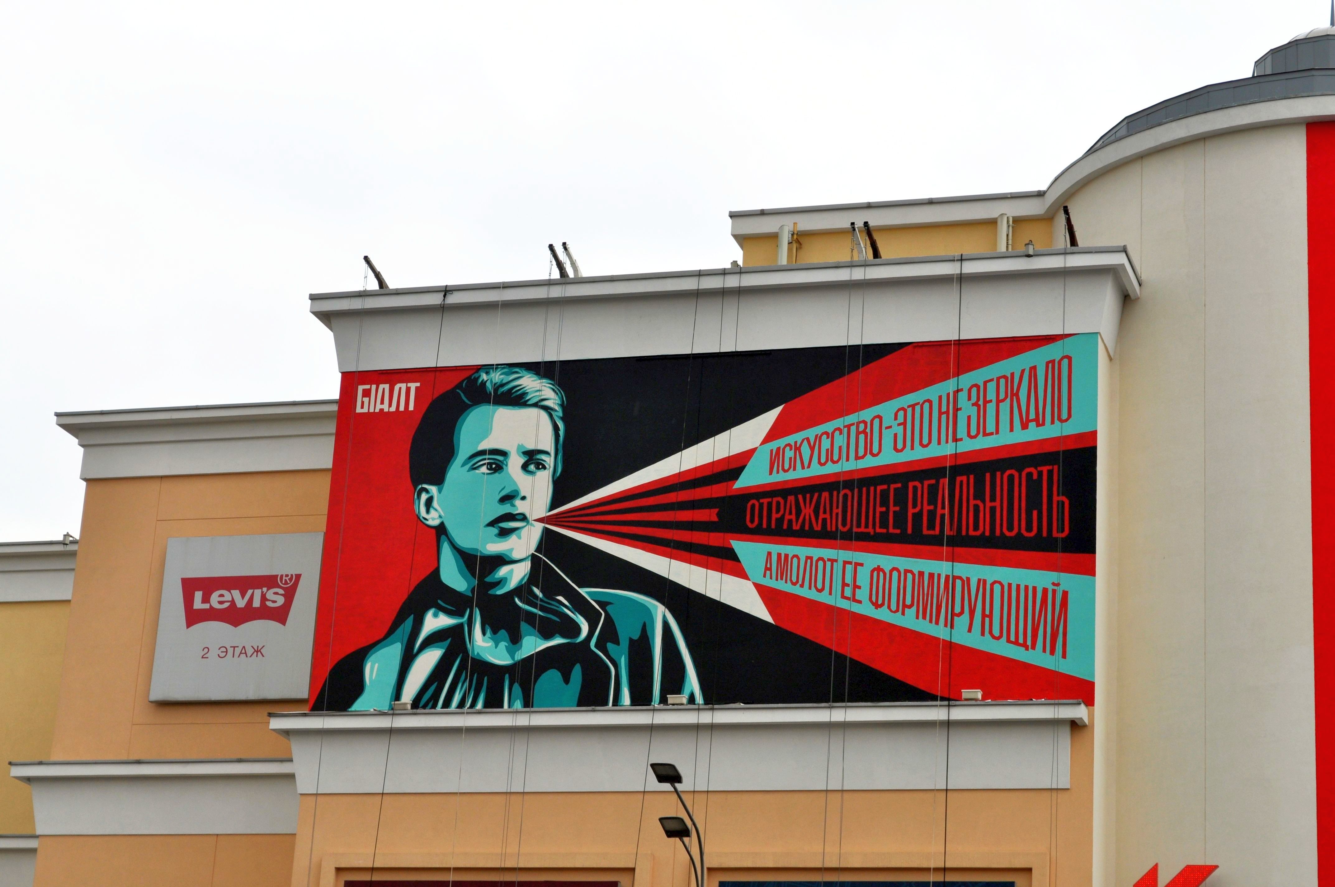 L’oeuvre An Art is not a mirror for reflecting Reality, but a Hammer that builds shape of it est de type graffiti. Vous pouvez l’admirer dans la ville de Moscow en Russia et plus précisément ici : Shopping Mall "Atrium", 33 Zemlyanoj Val, 105064 Moscow, Russia.