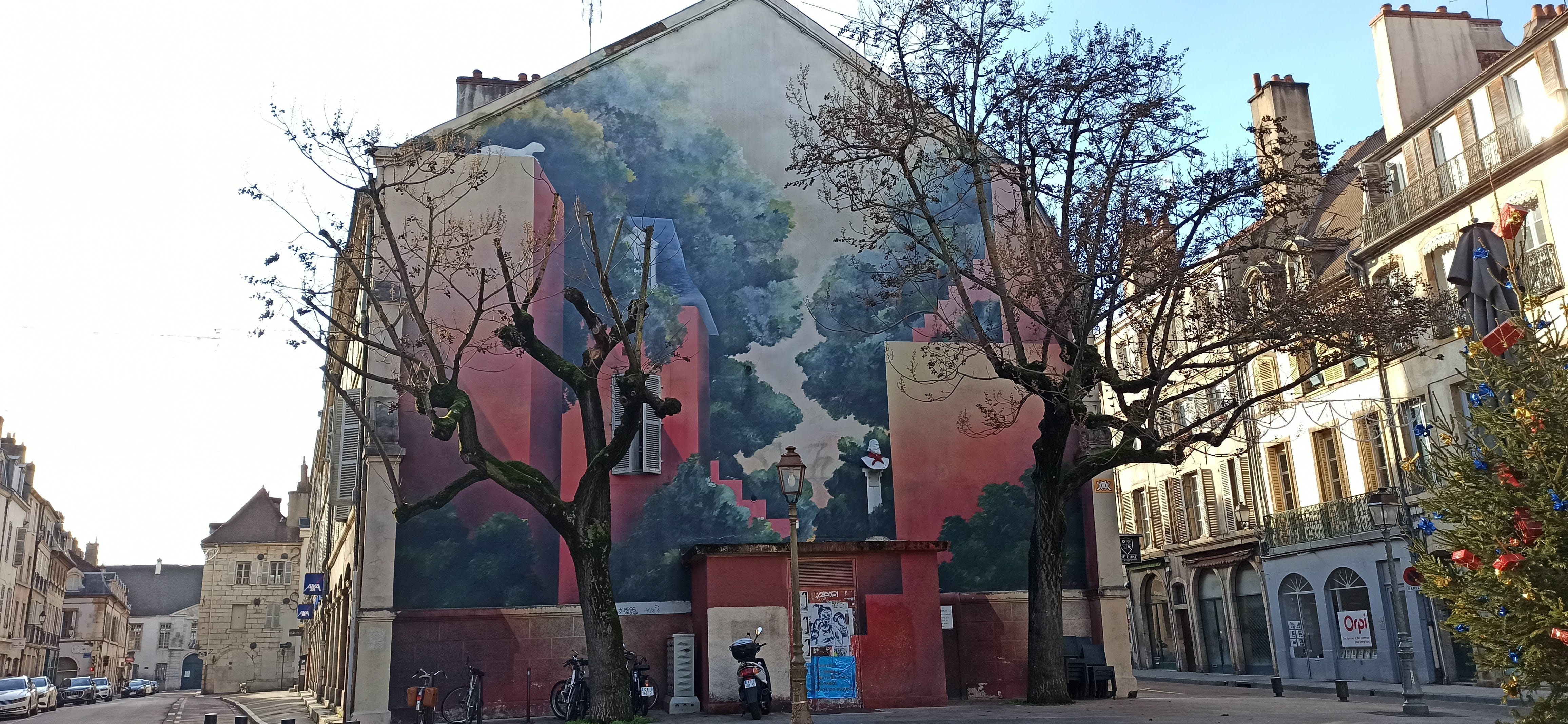 L’oeuvre est de type graffiti. Vous pouvez l’admirer dans la ville de Dijon en France et plus précisément ici : 39 Rue Auguste Comte, 21000 Dijon, France.