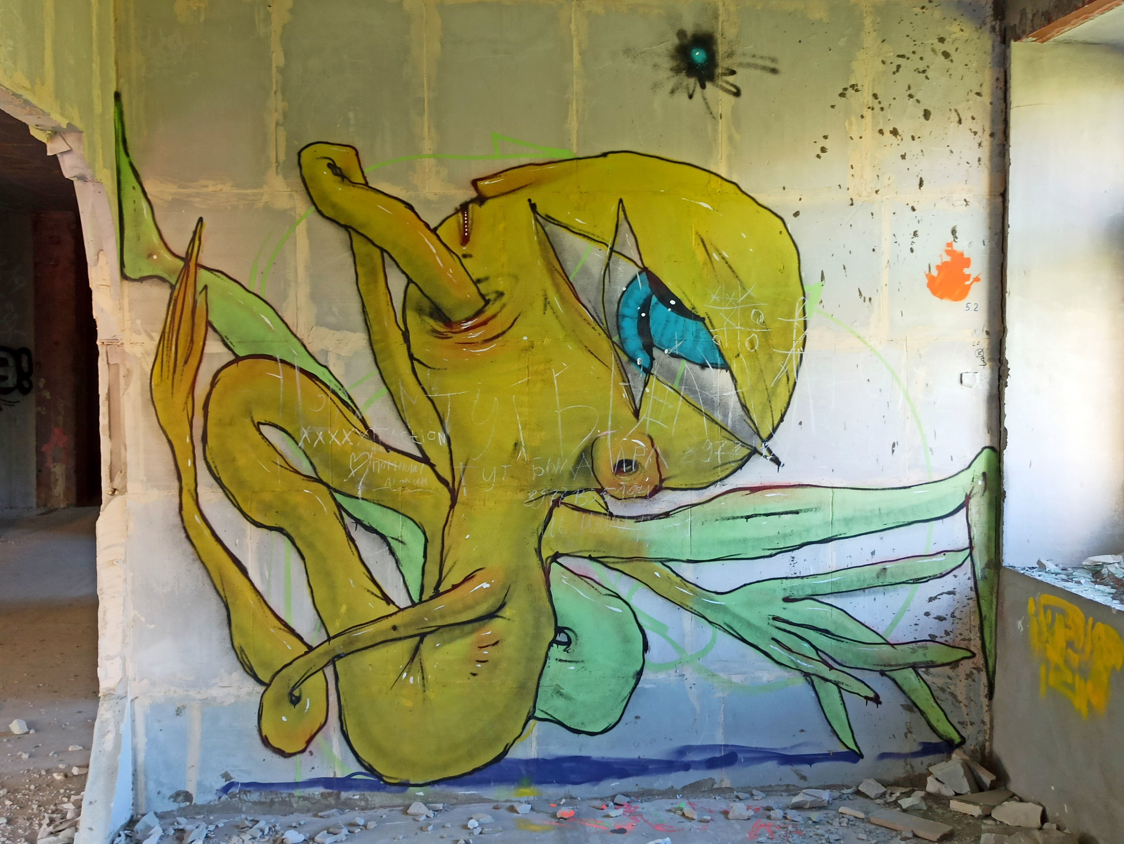 L’oeuvre est de type graffiti. Vous pouvez l’admirer dans la ville de Mytishchi en Russia et plus précisément ici : abandoned building - Oktyabr'sky av. 5A, 141014 Mytishchi, Moscow district, Russia.
