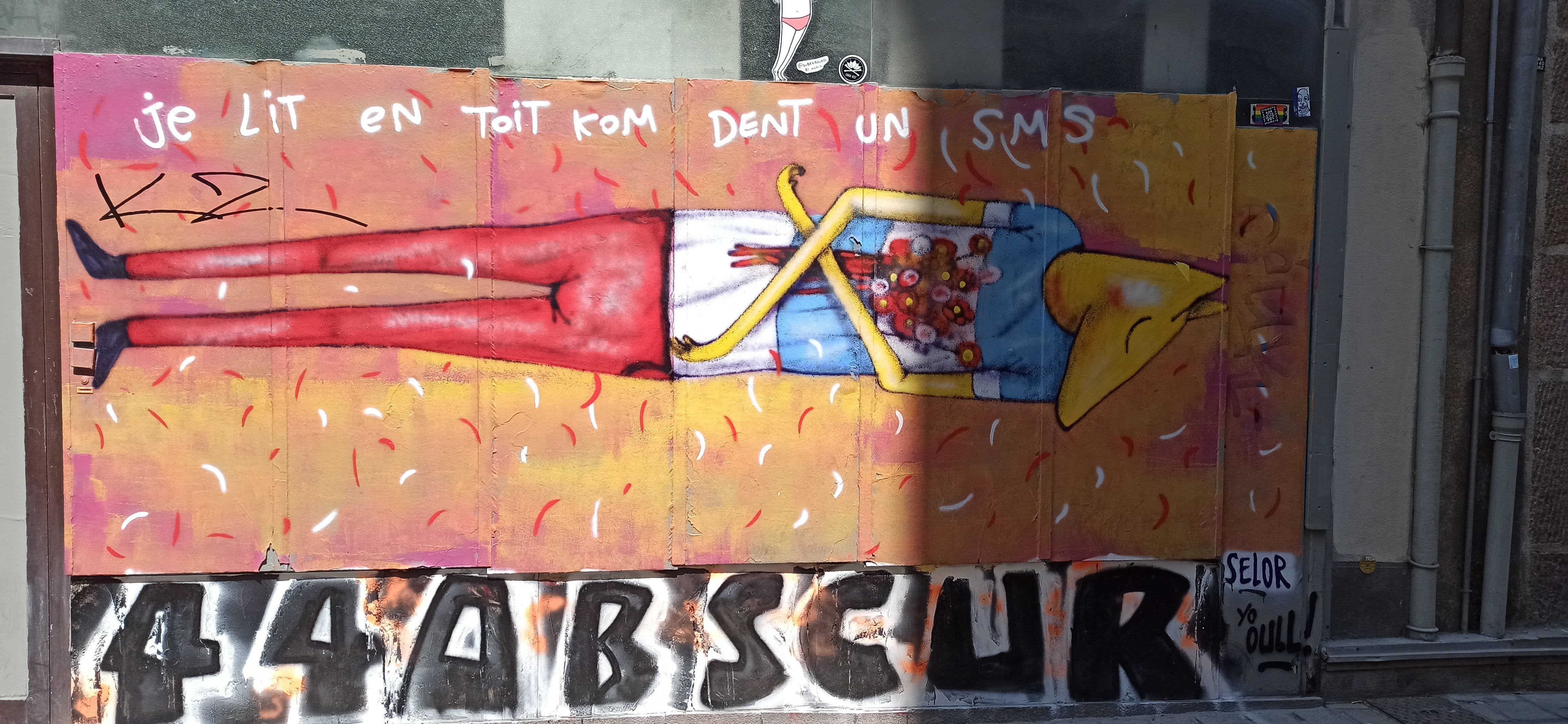 L’oeuvre est de type graffiti. Vous pouvez l’admirer dans la ville de Nantes en France et plus précisément ici : 3 Rue Saint-Léonard, 44000 Nantes, France.