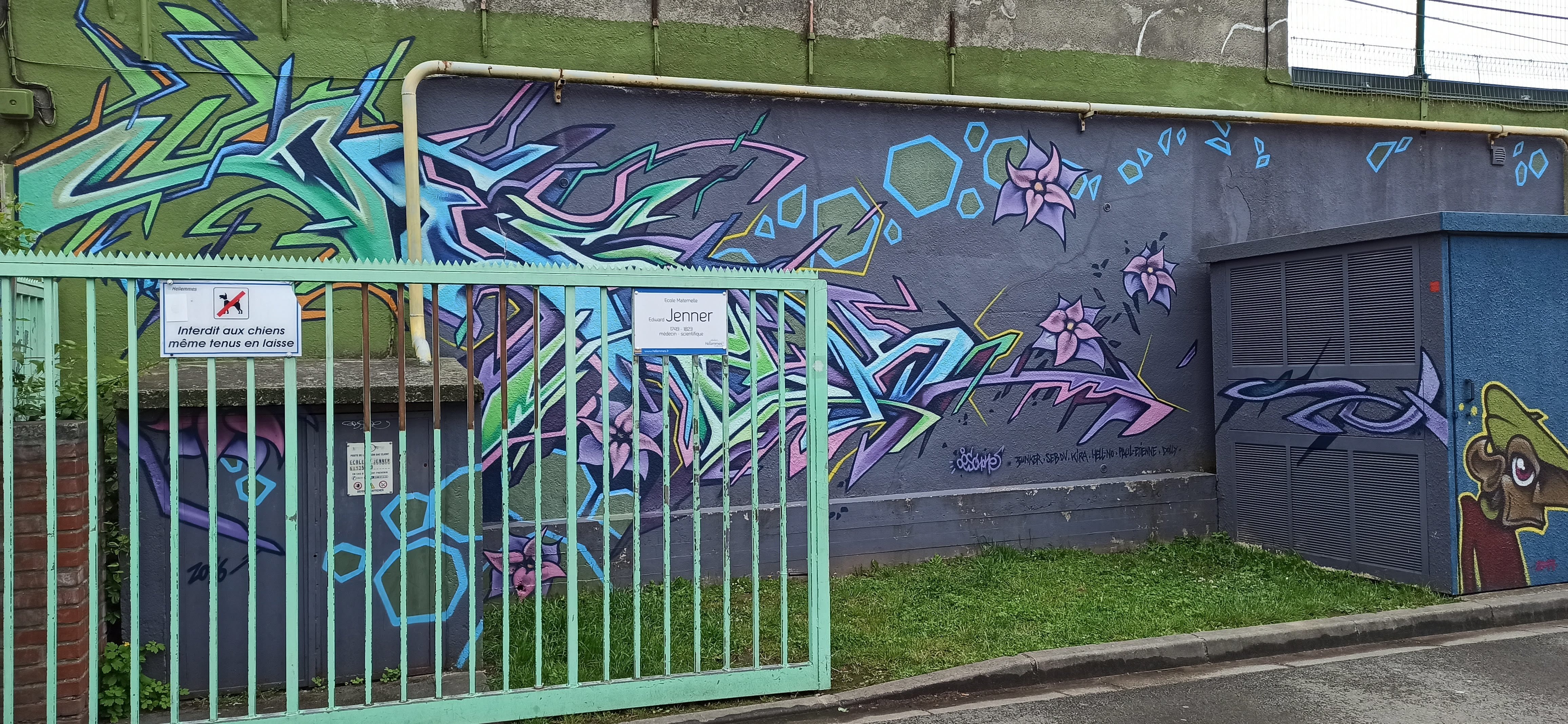 L’oeuvre est de type graffiti. Vous pouvez l’admirer dans la ville de Lille en France et plus précisément ici : 45 Rue des Écoles, 59800 Lille, France.
