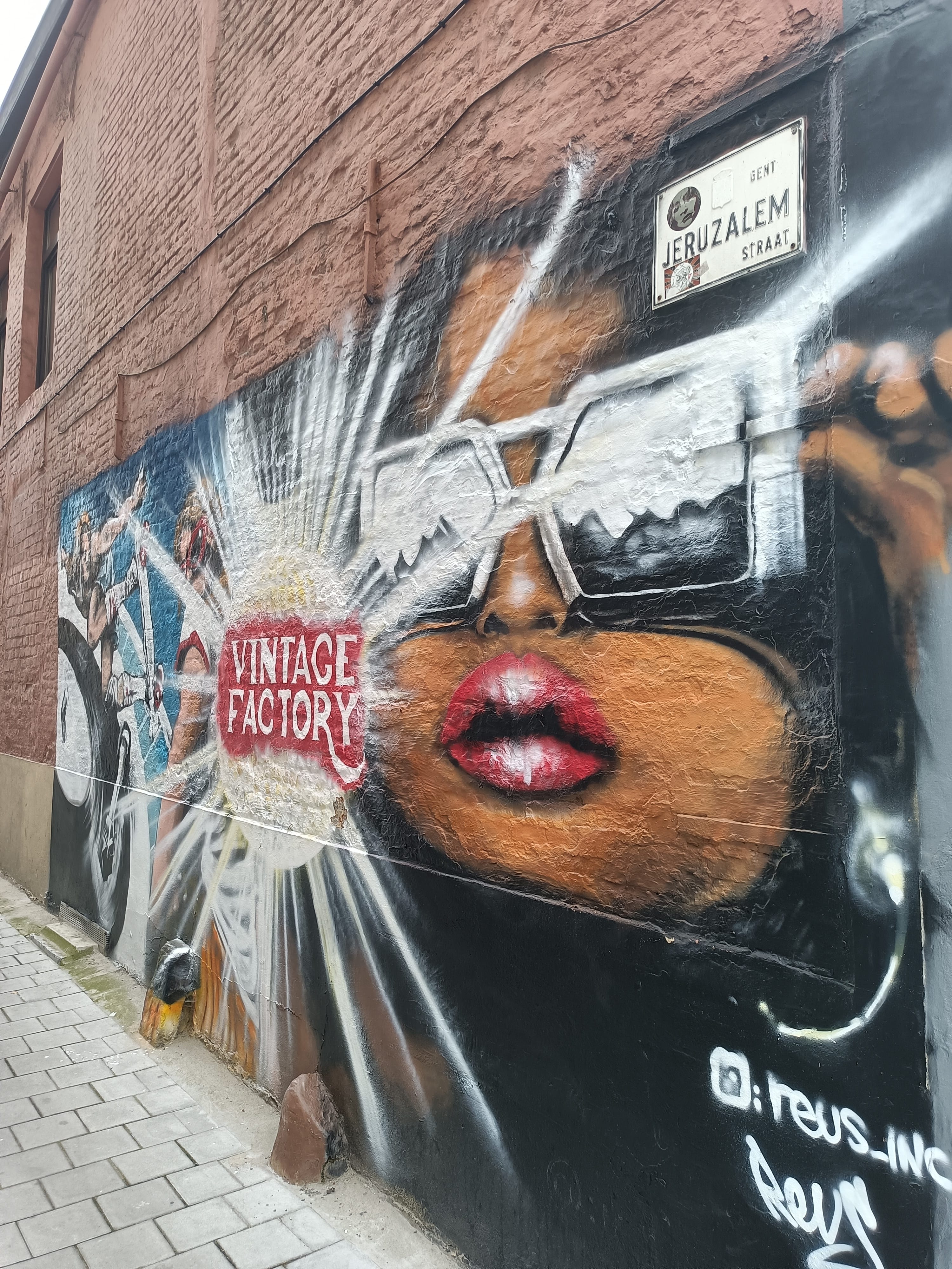 L’oeuvre est de type graffiti. Vous pouvez l’admirer dans la ville de Gent en Belgium et plus précisément ici : Nederkouter 8, 9000 Gent, Belgium.