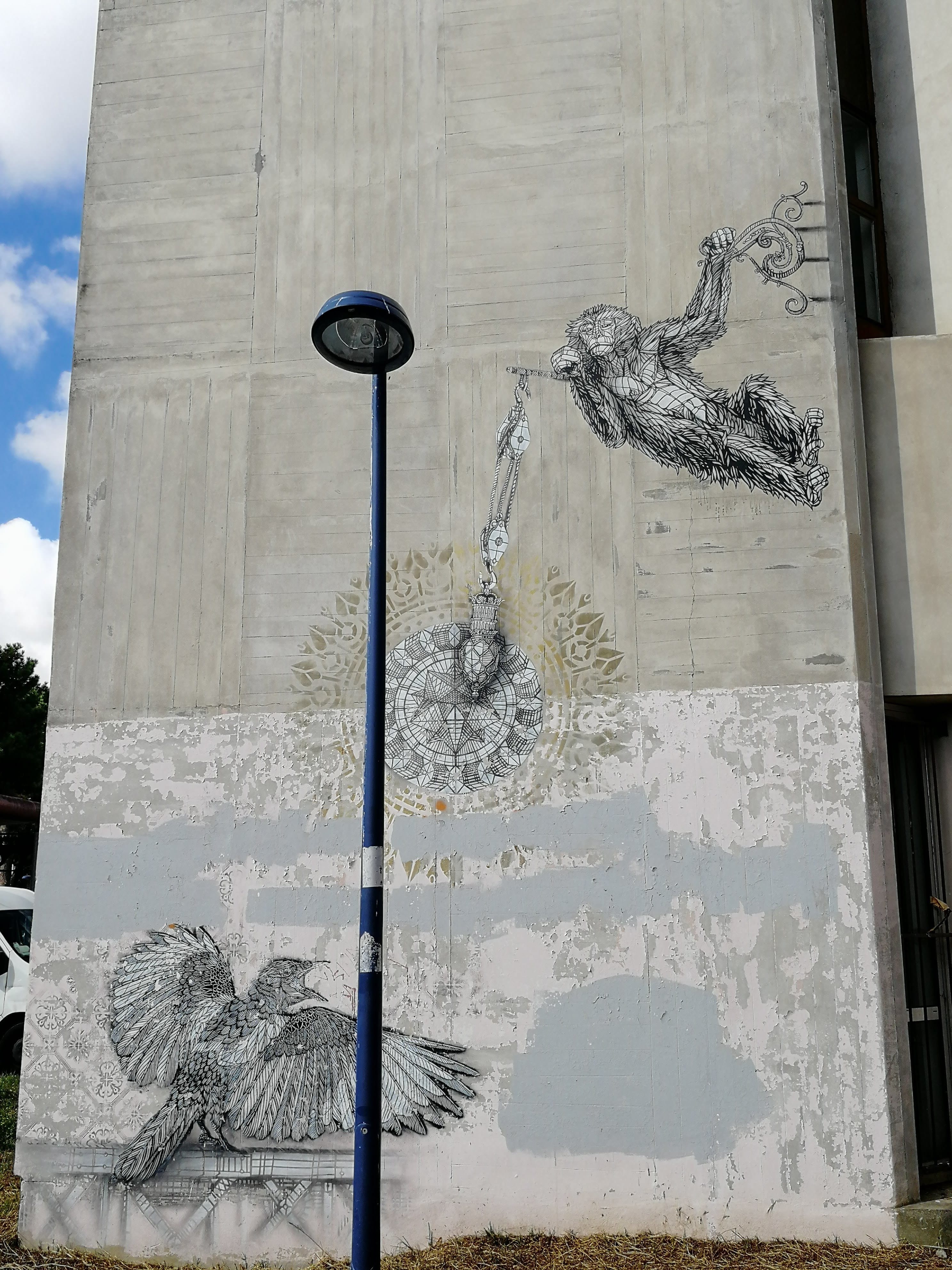 L’oeuvre est de type graffiti. Vous pouvez l’admirer dans la ville de Pessac en France et plus précisément ici : 1er étage Bâtiment A, Av. Jean Babin, 33600 Pessac, France.