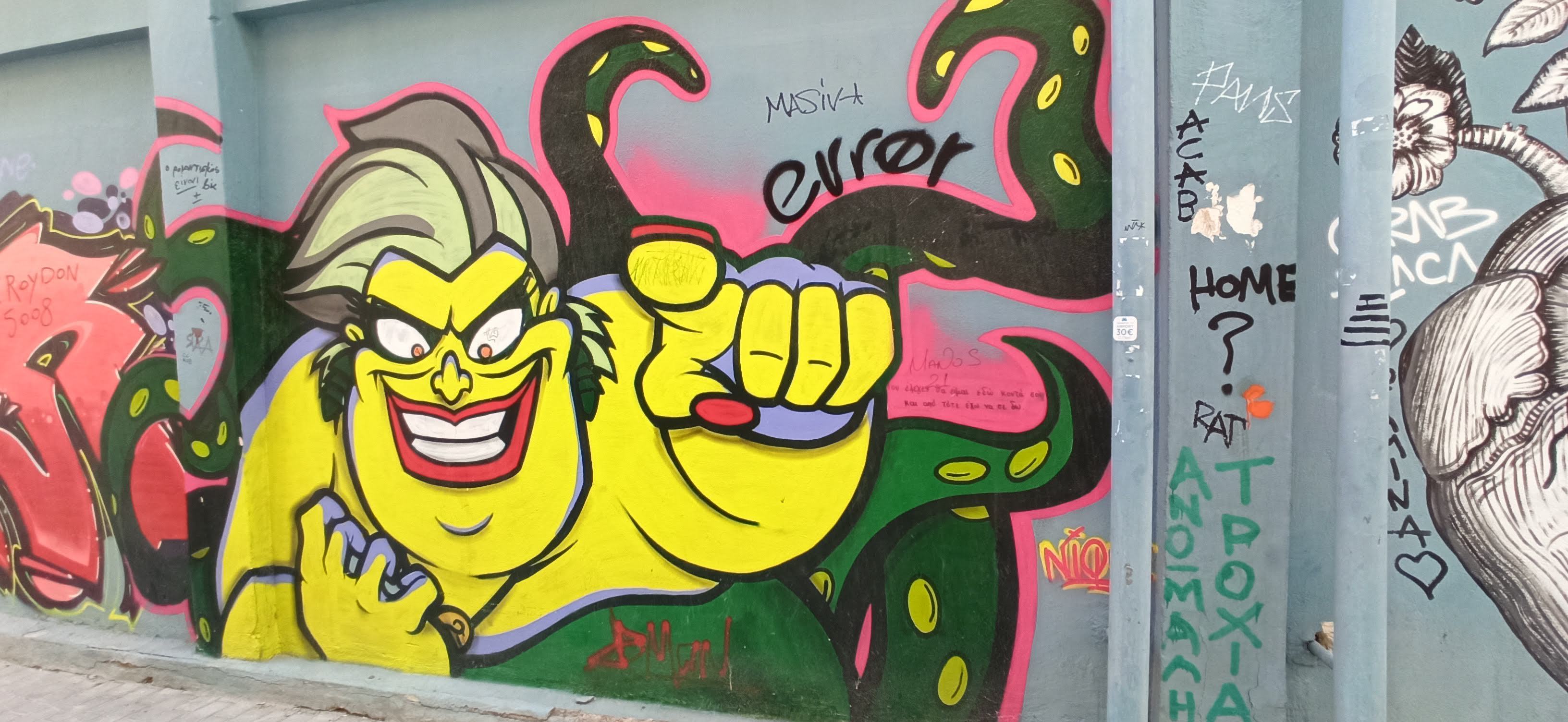 L’oeuvre est de type graffiti. Vous pouvez l’admirer dans la ville de Athina en Greece et plus précisément ici : Sarri 27, Athina 105 54, Greece.