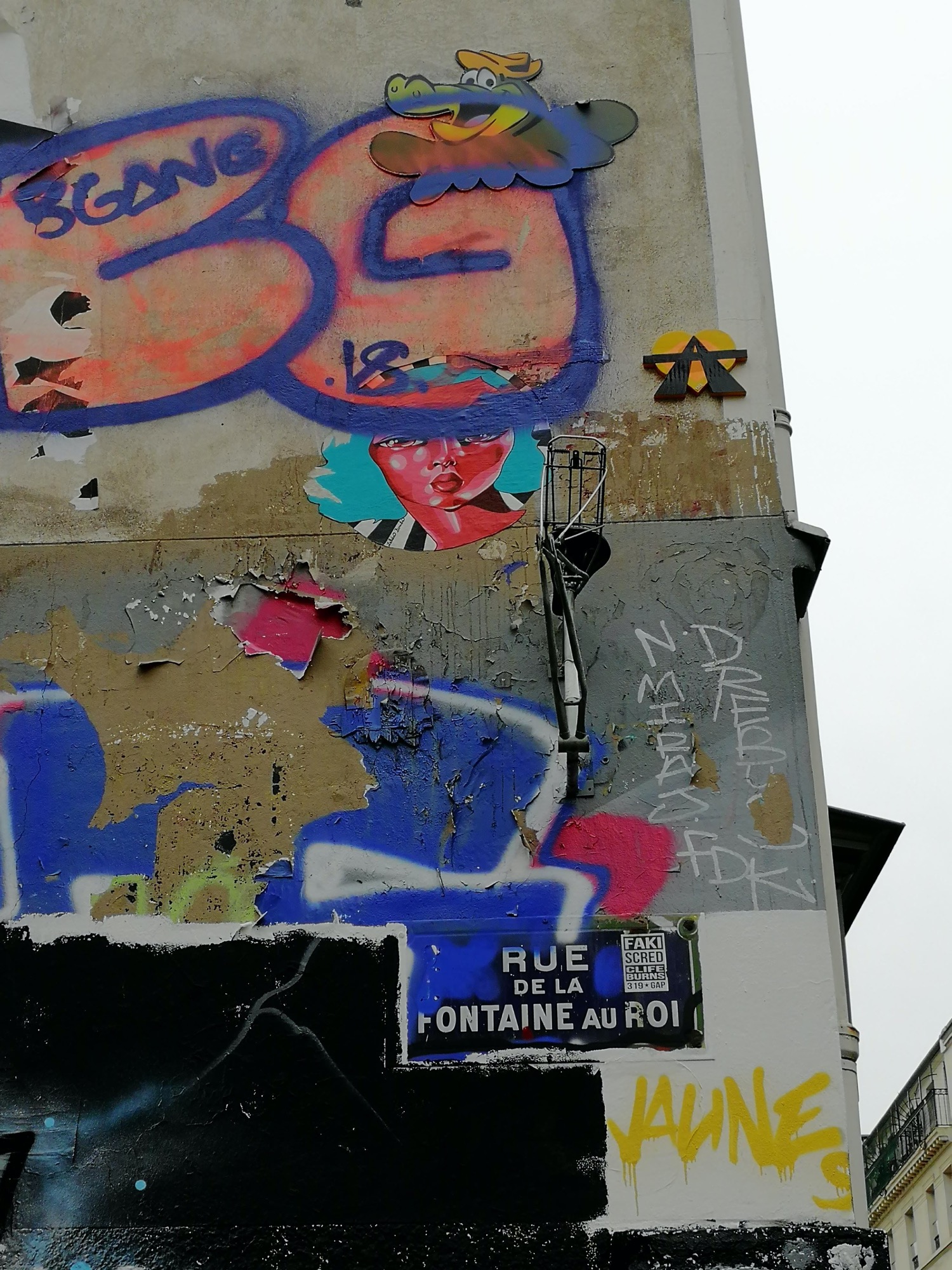 L’oeuvre est de type sticking. Vous pouvez l’admirer dans la ville de Paris en France et plus précisément ici : 65 Rue de la Fontaine au Roi, 75011 Paris, France.