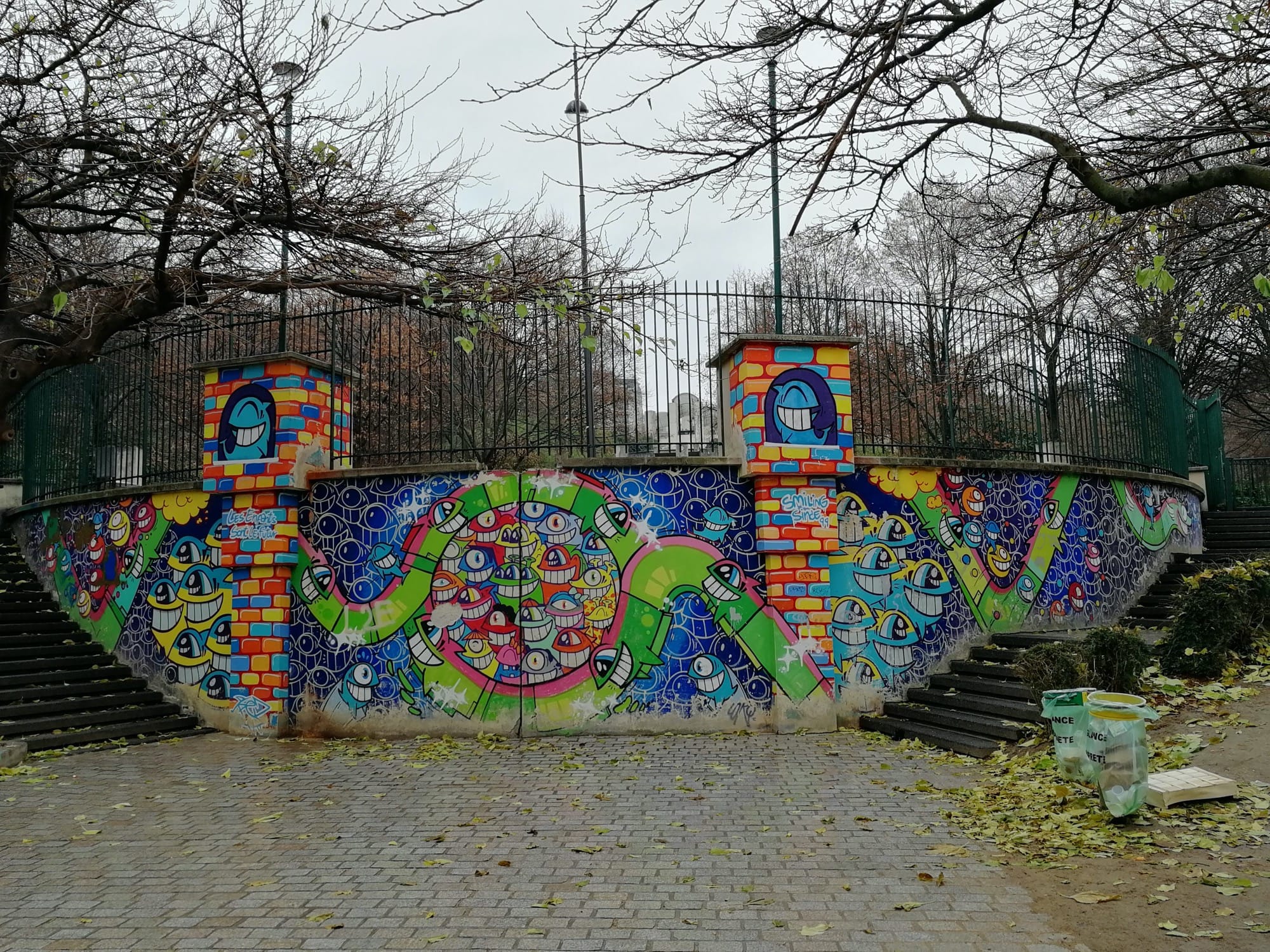 L’oeuvre est de type graffiti. Vous pouvez l’admirer dans la ville de Paris en France et plus précisément ici : Parc de Belleville, 47 Rue des Couronnes, 75020 Paris, France.