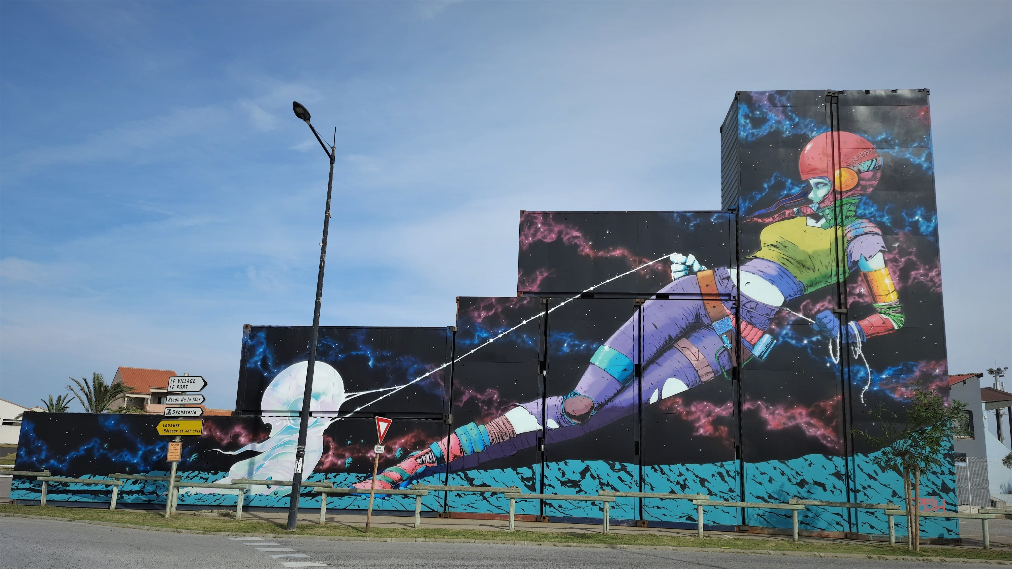 L’oeuvre est de type graffiti. Vous pouvez l’admirer dans la ville de Le Barcarès en France et plus précisément ici : 501F Rue Alain Colas, 66420 Le Barcarès, France.