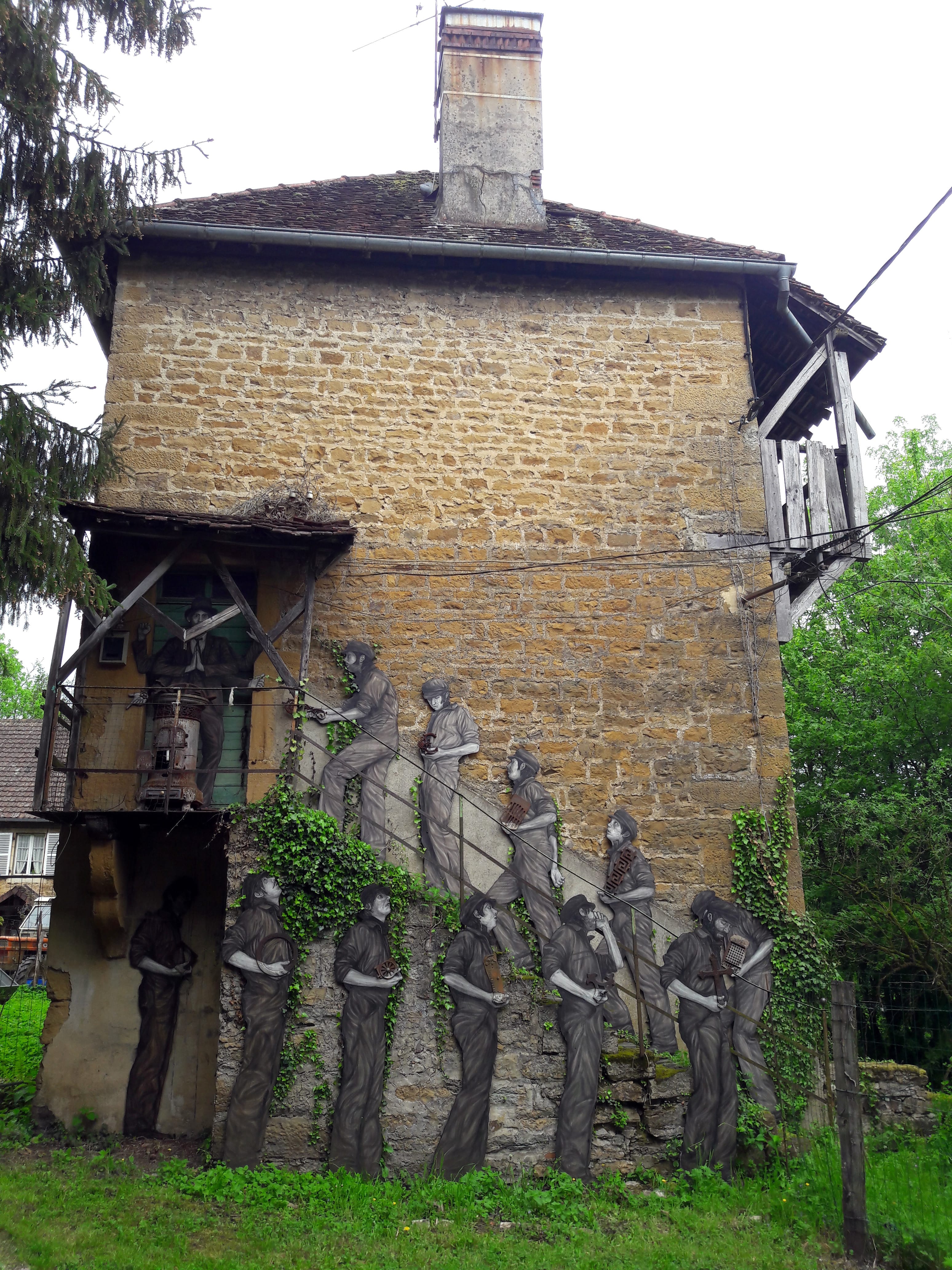 L’oeuvre est de type graffiti. Vous pouvez l’admirer dans la ville de Sellières en France et plus précisément ici : 7 Chem. de la Vaudriere, 39230 Sellières, France.